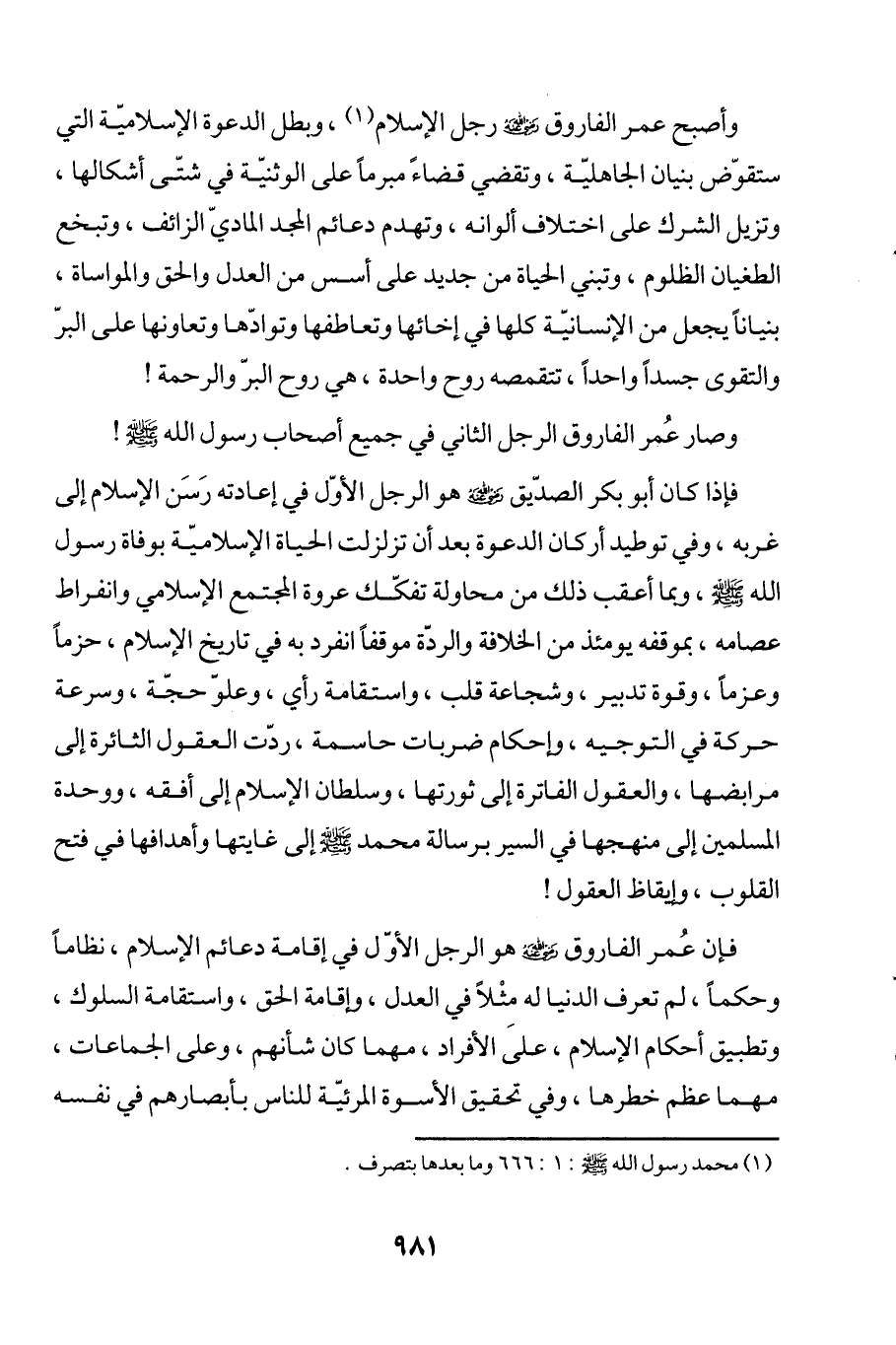 فإن عُمر الفاروق - رضي الله عنه - هو الرجل الأوّل في إقامة دعائم الإِسلام، نظاماً وحكماً، لم تعرف الدنيا له مِثْلاً في العدل، وإقامة الحق، واستقامة السلوك، وتطبيق أحكام الإِسلام، على الأفراد، مهما كان شأنهم، وعلى الجماعات، مهما عظم خطرها، وفي تحقيق الأسوة المرئيّة للناس بأبصارهم في نفسه