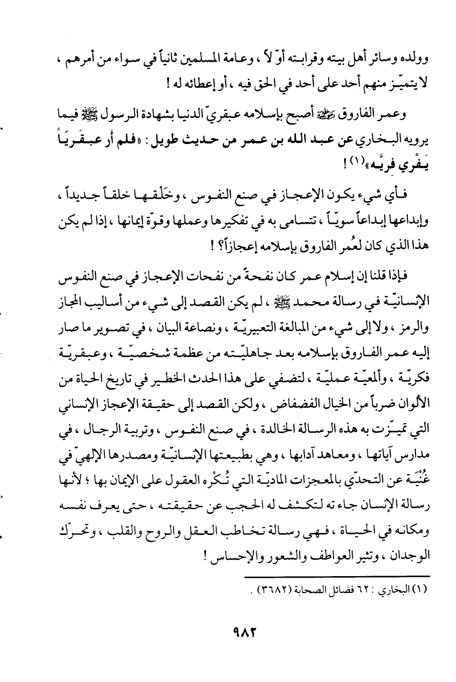 فأي شيء يكون الإعجاز في صنع النفوس، وخَلْقها خلقاً جديداً، وإبداعها إبداعاً سويًّا، تتسامى به في تفكيرها وعملها وقوّة إيمانها، إذا لم يكن هذا الذي كان لعُمر الفاروق بإسلامه إعجازاً؟!