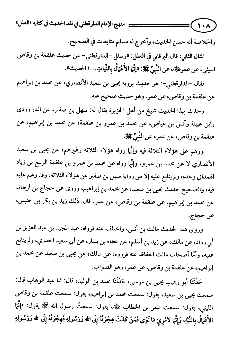 المثال الثاني: قال البرقاني في العلل: " وسئل - الدارقطني - عن حديث علقمة بن وقاص الليثي، عن عمر - رضي الله عنه -، عن النَّبِيِّ - صلى الله عليه وسلم -: ((إنِّمَا الأَعْمَالُ بِالْنِّياتِ)) الحديث ... ... فقال - الدارقطني -: هو حديث يرويه يحيى بن سعيد الأنصاري، عن محمد بن إبراهيم عن علقمة بن وقاص، عن عمر، وهو حديث صحيح عنه.