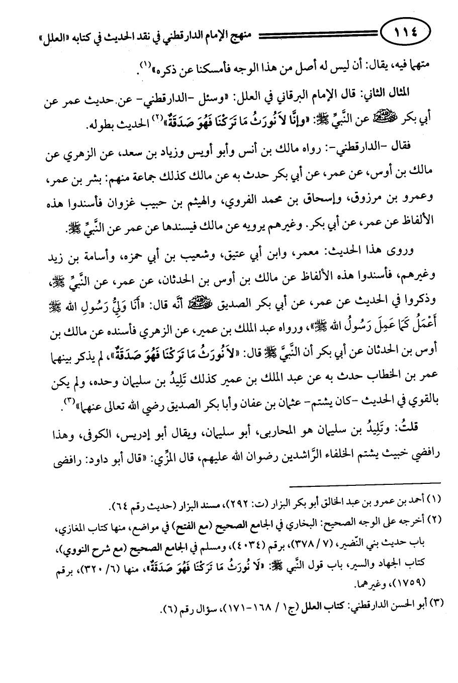 المثال الثاني: قال الإمام البرقاني في العلل: " وسئل - الدارقطني - عن حديث عمر عن أبي بكر - رضي الله عنهم - عن النَّبيِّ - صلى الله عليه وسلم -: ((وإنَّا لاَ نُورَثُ مَا تَرَكْنَا فَهُوَ صَدَقَةٌ)) (¬2) الحديث بطوله.
