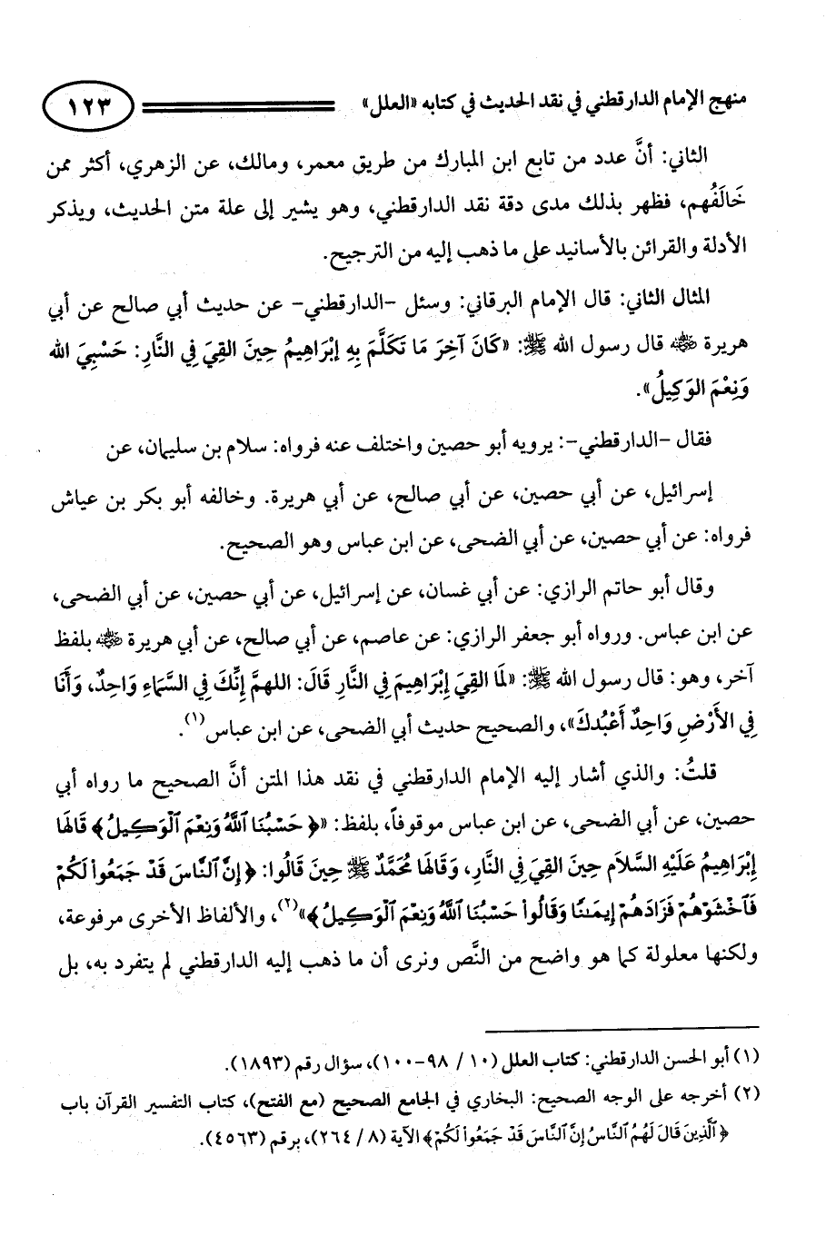قلتُ: والذي أشار إليه الإمام الدارقطني في نقد هذا المتن أنَّ الصحيح ما رواه أبي حصين، عن أبي الضحى، عن ابن عباس موقوفاً، بلفظ " (({حَسْبُنَا اللَّهُ وَنِعْمَ الْوَكِيلُ} قَالَهَا إِبْرَاهِيمُ عَلَيْهِ السَّلاَم حِينَ أُلْقِيَ فِي النَّارِ، وَقَالَهَا مُحَمَّدٌ - صلى الله عليه وسلم - حِينَ قَالُوا: {إِنَّ النَّاسَ قَدْ جَمَعُوا لَكُمْ فَاخْشَوْهُمْ فَزَادَهُمْ إِيمَانًا وَقَالُوا حَسْبُنَا اللَّهُ وَنِعْمَ الْوَكِيلُ})) (¬2)، والألفاظ الأخرى مرفوعة، ولكنها معلولة كما هو واضح من النَّص ونرى أن ما ذهب إليه الدارقطني لم يتفرد به، بل