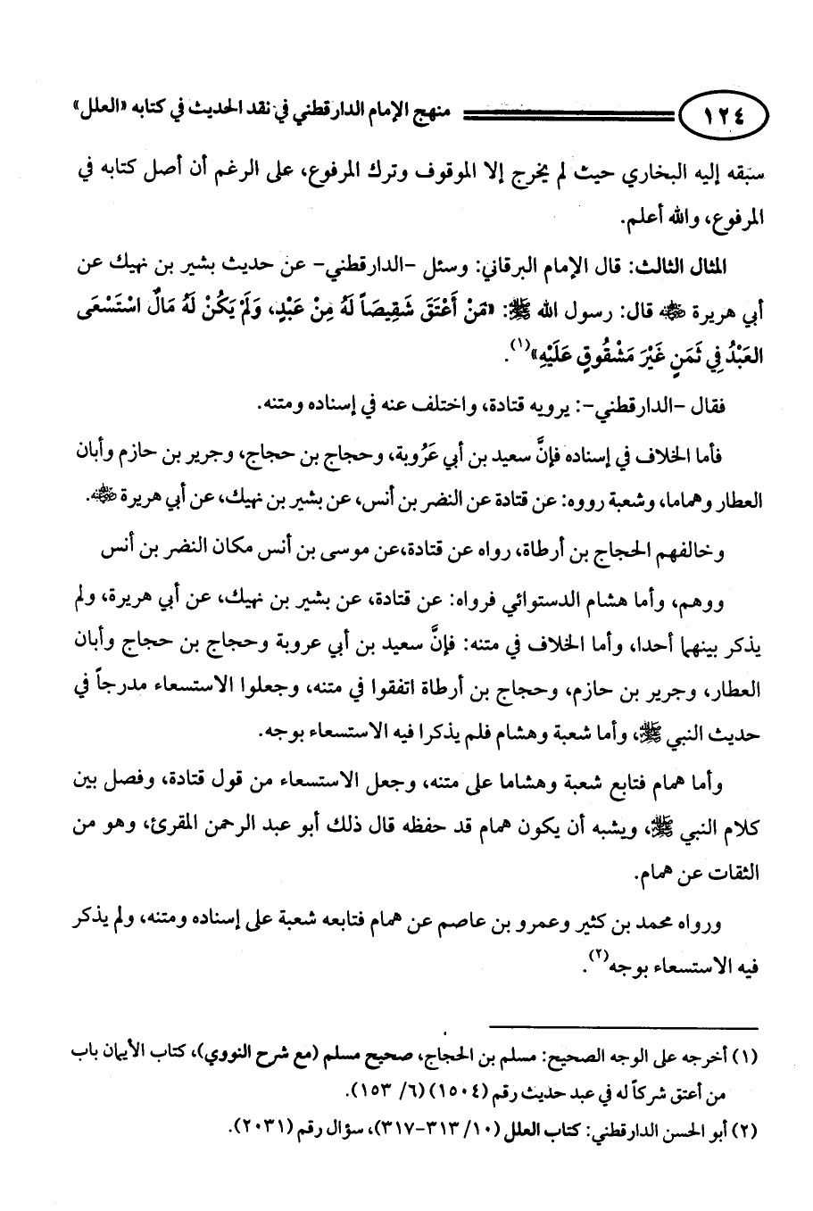 المثال الثالث: قال الإمام البرقاني: " وسئل - الدارقطني - عن حديث بشير بن نهيك عن أبي هريرة - رضي الله عنه - قال: رسول الله - صلى الله عليه وسلم -: " ((مَنْ أَعْتَقَ شَقِيصَاً لَهُ مِنْ عَبْدٍ، وَلَمْ يَكُنْ لَهُ مَالٌ اسْتَسْعَى الْعَبْدُ فِي ثَمَنٍ غَيْرَ مَشْقُوقٍ عَلَيْهِ)) (¬1).
