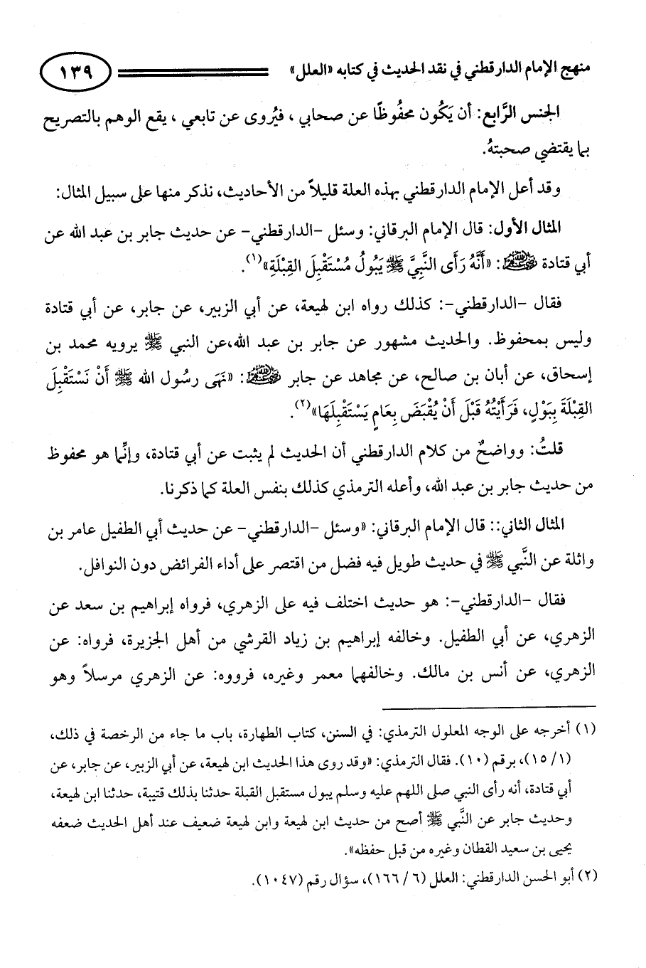 المثال الأول: قال الإمام البرقاني: " وسئل - الدارقطني - عن حديث جابر بن عبدالله عن أبي قتادة - رضي الله عنهم -: ((أَنَّهُ رَأَى النَّبِيَّ - صلى الله عليه وسلم - يَبُولُ مُسْتَقْبِلَ الْقِبْلَةِ)) (¬1).