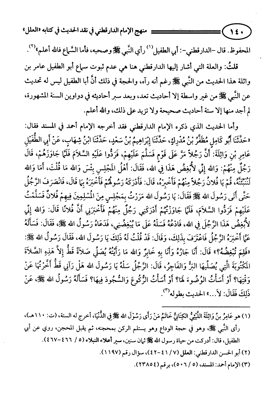 وأما الحديث الذي ذكره الإمام الدارقطني فقد أخرجه الإمام أحمد في المسند فقال: "حَدَّثَنَا أَبُو كَامِلٍ مُظَفَّرُ بْنُ مُدْرِكٍ، حَدَّثَنَا إِبْرَاهِيمُ بْنُ سَعْدٍ، حَدَّثَنَا ابْنُ شِهَابٍ، عَنْ أَبِي الطُّفَيْلِ عَامِرِ بْنِ وَاثِلَةَ: ((أَنَّ رَجُلاً مَرَّ عَلَى قَوْمٍ فَسَلَّمَ عَلَيْهِمْ، فَرَدُّوا عَلَيْهِ السَّلاَمَ فَلَمَّا جَاوَزَهُمْ، قَالَ رَجُلٌ مِنْهُمْ وَاللَّهِ إِنِّي لأُبْغِضُ هَذَا فِي اللَّهِ، فَقَالَ: أَهْلُ الْمَجْلِسِ بِئْسَ وَاللَّهِ مَا قُلْتَ أَمَا وَاللَّهِ لَنُنَبِّئَنَّهُ، قُمْ يَا فُلانُ رَجُلاً مِنْهُمْ فَأَخْبِرْهُ، قَالَ: فَأَدْرَكَهُ رَسُولُهُمْ فَأَخْبَرَهُ بِمَا قَالَ، فَانْصَرَفَ الرَّجُلُ حَتَّى أَتَى رَسُولَ اللَّهِ صَلَّى اللَّه عَلَيْهِ وَسَلَّمَ فَقَالَ: يَا رَسُولَ اللَّهِ مَرَرْتُ بِمَجْلِسٍ مِنَ الْمُسْلِمِينَ فِيهِمْ فُلانٌ فَسَلَّمْتُ عَلَيْهِمْ فَرَدُّوا السَّلاَمَ فَلَمَّا جَاوَزْتُهُمْ، أَدْرَكَنِي رَجُلٌ مِنْهُمْ فَأَخْبَرَنِي أَنَّ فُلانًا قَالَ وَاللَّهِ إِنِّي لأُبْغِضُ هَذَا الرَّجُلَ فِي اللَّهِ فَادْعُهُ فَسَلْهُ عَلَى مَا يُبْغِضُنِي، فَدَعَاهُ رَسُولُ اللَّهِ صَلَّى اللَّهم عَلَيْهِ وَسَلَّمَ، فَقَالَ: فَسَأَلَهُ عَمَّا أَخْبَرَهُ الرَّجُلُ فَاعْتَرَفَ بِذَلِكَ وَقَالَ: قَدْ قُلْتُ لَهُ ذَلِكَ يَا رَسُولَ اللَّهِ، فَقَالَ: رَسُولُ اللَّهِ صَلَّى اللَّه عَلَيْهِ وَسَلَّمَ فَلِمَ تُبْغِضُهُ؟، قَالَ: أَنَا جَارُهُ وَأَنَا بِهِ خَابِرٌ وَاللَّهِ مَا رَأَيْتُهُ يُصَلِّي صَلاَةً قَطُّ إِلاَّ هَذِهِ الصَّلاَةَ الْمَكْتُوبَةَ الَّتِي يُصَلِّيهَا الْبَرُّ وَالْفَاجِرُ، قَالَ: الرَّجُلُ سَلْهُ يَا رَسُولَ اللَّهِ هَلْ رَآنِي قَطُّ أَخَّرْتُهَا عَنْ وَقْتِهَا؟، أَوْ أَسَاتُ الْوُضُوءَ لَهَا؟، أَوْ أَسَاتُ الرُّكُوعَ