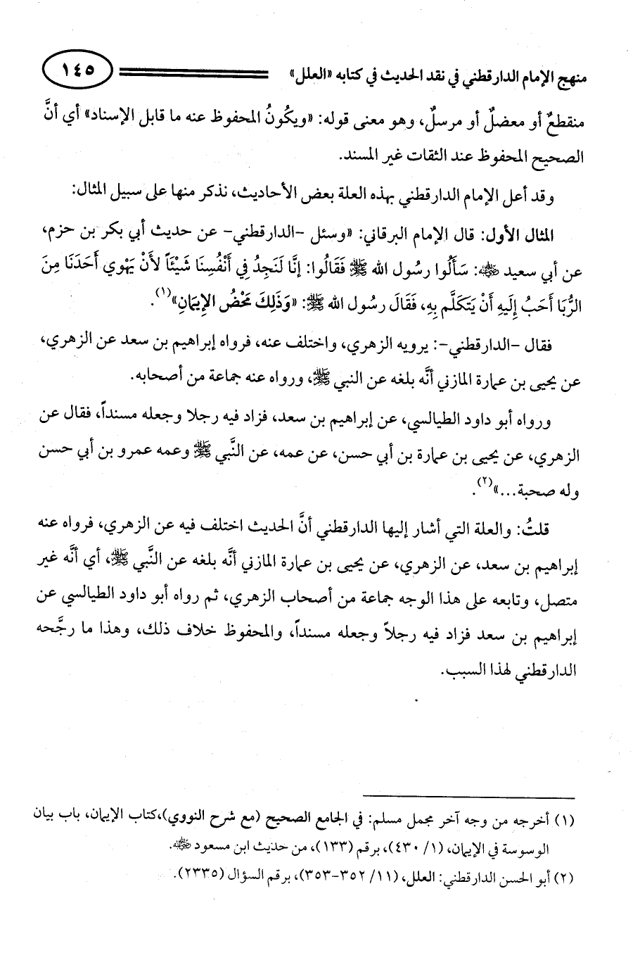 المثال الأول: قال الإمام البرقاني: " وسئل - الدارقطني - عن حديث أبي بكر بن حزم، عن أبي سعيد - رضي الله عنه -: ((سَأَلُوا رسُول اللهِ - صلى الله عليه وسلم - فَقَالُوا: إنَّا لَنَجِدُ فِي أَنْفُسِنَا شَيْئَاً لأَنْ يَهْوي أَحَدَنَا مِنَ الرُّبَا أَحَبُ إِلَيهِ أَنْ يَتَكَلَّم بِهِ، فَقَالَ: رسُول اللهِ صَلَّى اللهُ عَلَيْهِ وَسَلَّمَ: وَذَلِكَ مَحْضُ الإِيمَانِ)) (¬1).