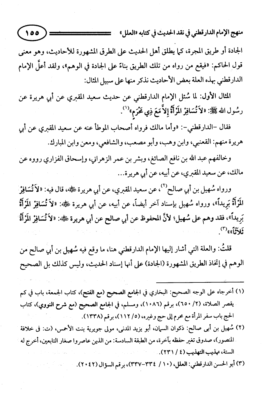 المثال الأول: لما سُئل الإمام الدارقطني عن حديث سعيد المقبري عن أبي هريرة عن رسُول الله - صلى الله عليه وسلم -: ((لاَ تُسَافِرْ الْمَرْأَةُ إِلاَّ مَعَ ذِي مَحْرَمٍ)) (¬1).
