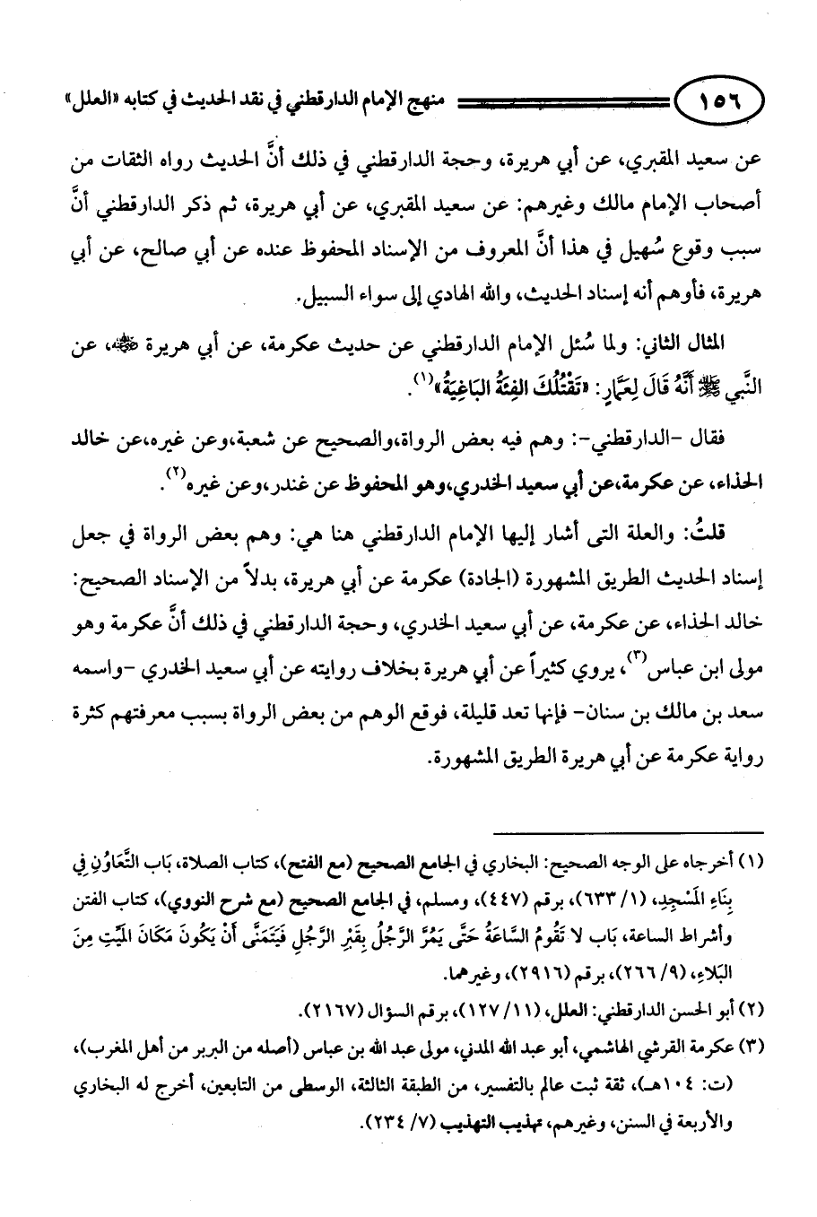 المثال الثاني: ولما سُئل الإمام الدارقطني عن حديث عكرمة، عن أبي هريرة - رضي الله عنه -، عن النَّبي - صلى الله عليه وسلم -: ((أَنَّهُ قَالَ لِعَمَّارٍ: تَقْتُلُكَ الْفِئَةُ الْبَاغِيَةُ)) (¬1).