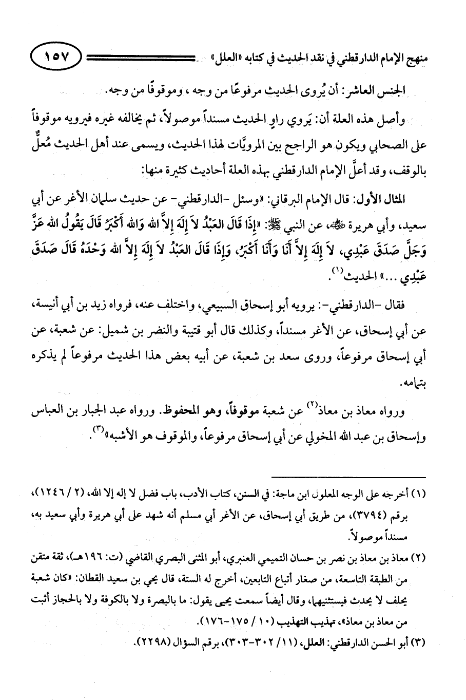 المثال الأول: قال الإمام البرقاني: " وسئل - الدارقطني- عن حديث سلمان الأغر عن أبي سعيد، وأبي هريرة - رضي الله عنه -، عن النبي - صلى الله عليه وسلم -: ((إِذَا قَالَ الْعَبْدُ لاَ إِلَهَ إِلاَّ اللَّهُ وَاللَّهُ أَكْبَرُ قَالَ يَقُولُ اللَّهُ عَزَّ وَجَلَّ صَدَقَ عَبْدِي، لاَ إِلَهَ إِلاَّ أَنَا وَأَنَا أَكْبَرُ، وَإِذَا قَالَ الْعَبْدُ لاَ إِلَهَ إِلاَّ اللَّهُ وَحْدَهُ قَالَ صَدَقَ عَبْدِي ...)) (¬1) الحديث.