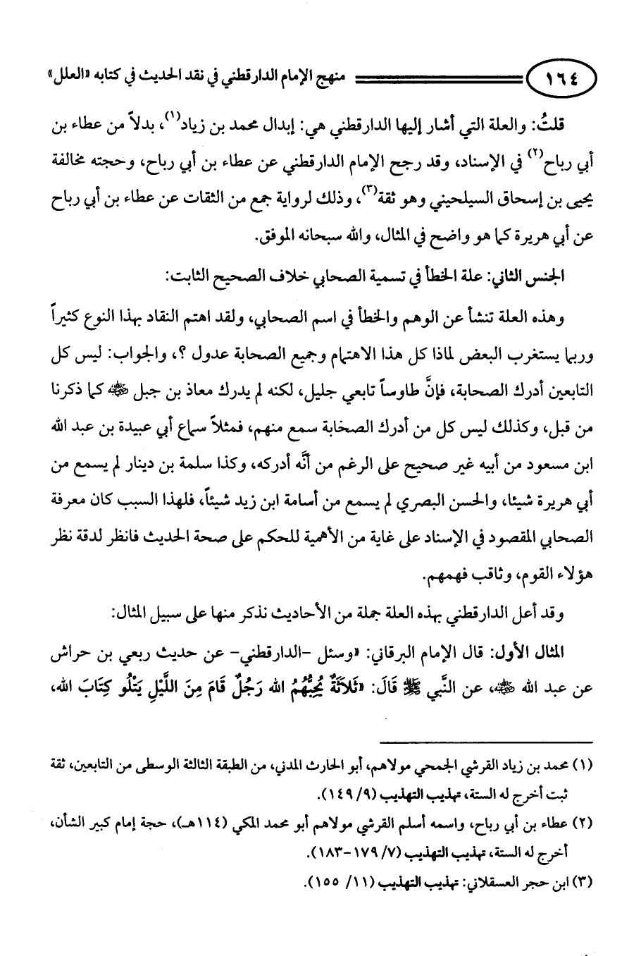 قلتُ: والعلة التي أشار إليها الدارقطني هي: إبدال محمد بن زياد (¬2)، بدلاً من عطاء بن أبي رباح (¬3) في الإسناد، وقد رجح الإمام الدارقطني عن عطاء بن أبي رباح، وحجته مخالفة يحيى بن إسحاق السيلحيني وهو ثقة (¬4)، وذلك لرواية جمع من الثقات عن عطاء بن أبي رباح عن أبي هريرة كما هو واضح في المثال، والله سبحانه الموفق.