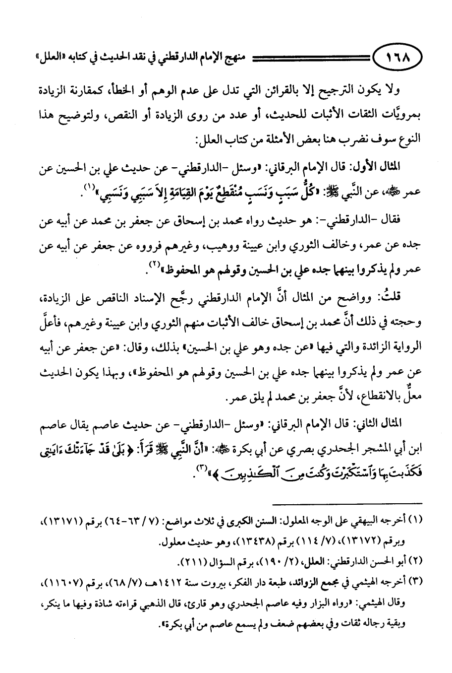 المثال الأول: قال الإمام البرقاني: " وسئل - الدارقطني - عن حديث علي بن الحسين عن عمر - رضي الله عنه -، عن النَّبي صَلَّى اللَّه عَلَيْهِ وَسَلَّمَ: ((كُلُّ سَبَبٍ وَنَسَبٍ مُنْقَطِعٌ يَوْمَ الْقِيَامَةِ إِلاَ سَبَبِي وَنَسَبِي)) (¬1).