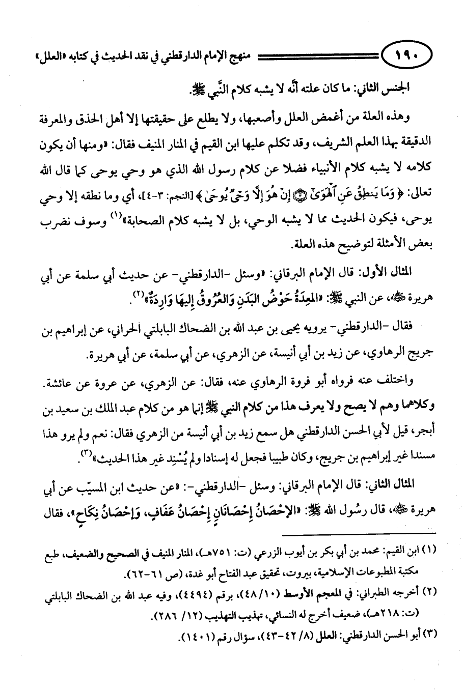 المثال الثاني: قال الإمام البرقاني: " وسئل - الدارقطني -: " عن حديث ابن المسيّب عن أبي هريرة - رضي الله عنه -، قال رسُول اللهِ صَلَّى اللهُ عَلَيهِ وَسَلَّمَ: ((الإحْصَانُ إِحْصَانَانِ إِحْصَانُ عَفَافٍ، وَإحْصَانُ نِكَاحٍ))، فقال