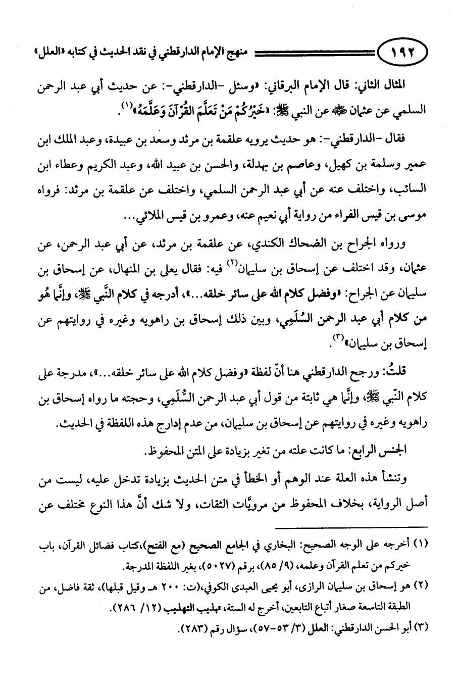 المثال الثاني: قال الإمام البرقاني: "وسئل - الدارقطني -: عن حديث أبي عبدالرحمن السلمي عن عثمان - رضي الله عنه - عن النبي - صلى الله عليه وسلم -: ((خَيْرُكُمْ مَنْ تَعَلَّمَ الْقُرْآنَ وَعَلَّمَهُ)) (¬1).