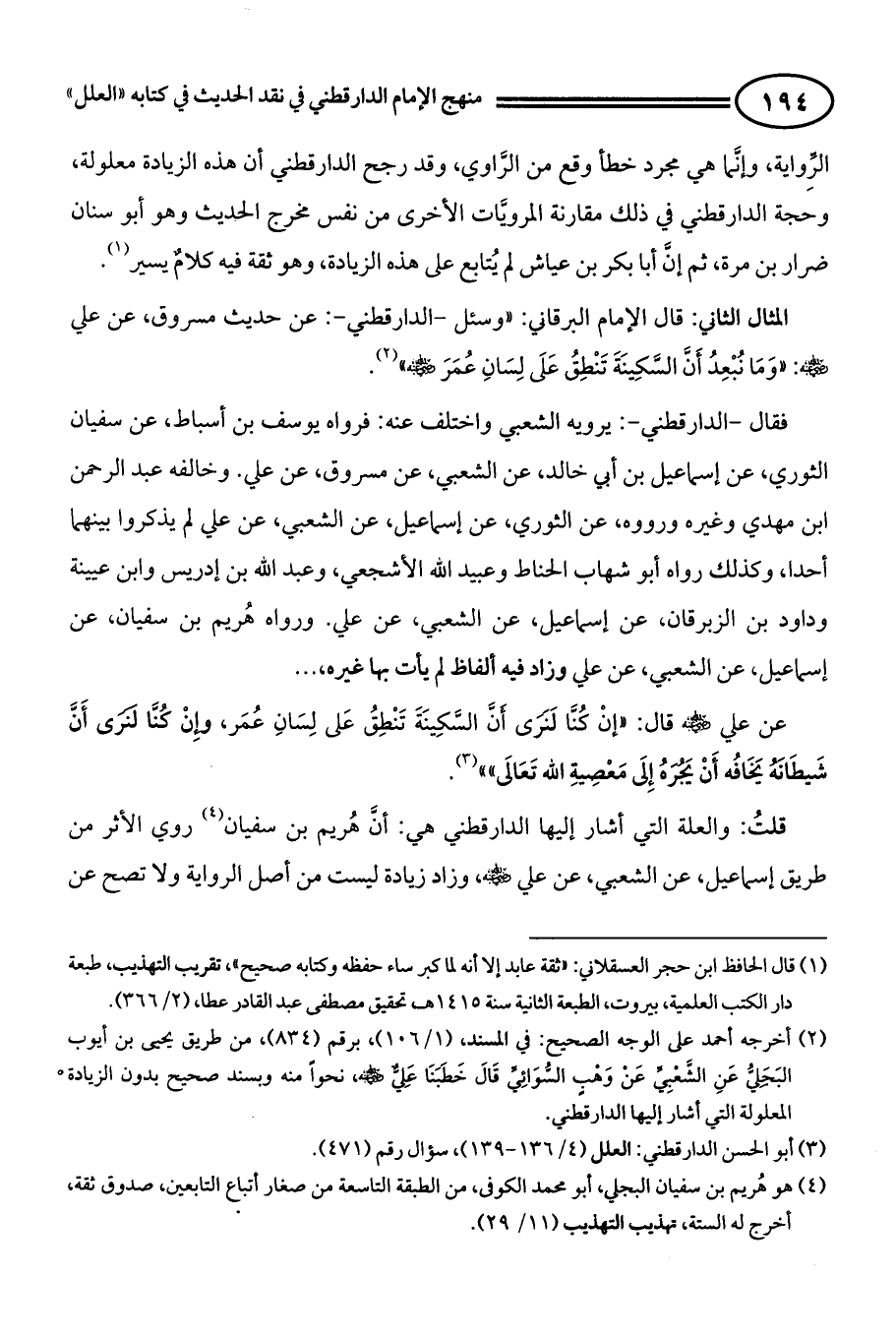 المثال الثاني: قال الإمام البرقاني: "وسئل - الدارقطني -: عن حديث مسروق، عن علي - رضي الله عنه -: ((وَمَا نُبْعِدُ أَنَّ السَّكِينَةَ تَنْطِقُ عَلَى لِسَانِ عُمَرَ رَضِي اللَّه عَنْه)) (¬2).