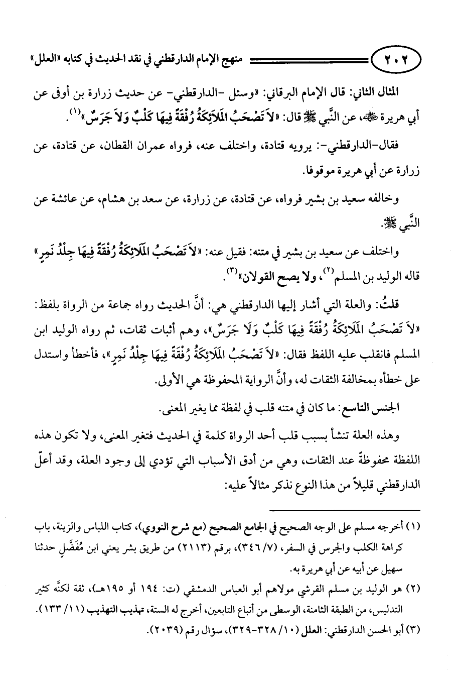 المثال الثاني: قال الإمام البرقاني: "وسئل - الدارقطني - عن حديث زرارة بن أوفى عن أبي هريرة - رضي الله عنه -، عن النَّبي صَلَّى اللهُ عَلَيهِ وَسَلَّمَ قال: ((لاَ تَصْحَبُ الْمَلاَئِكَةُ رُفْقَةً فِيهَا كَلْبٌ وَلاَ جَرَسٌ)) (¬1).