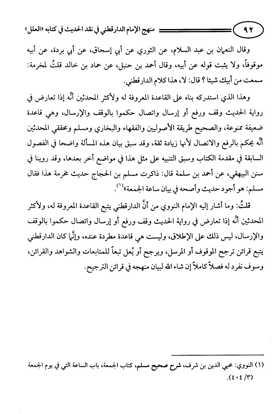قلتُ: وما أشار إليه الإمام النووي من أنَّ الدارقطني يتبع القاعدة المعروفة له، ولأكثر المحدثين أنَّه إذا تعارض في رواية الحديث وقف ورفع أو إرسال واتصال حكموا بالوقف والإرسال، ليس ذلك على الإطلاق، وليست هي قاعدة مطردة عنده، وإنَّما كان الدارقطني يتبع قرائن ترجح الموقوف أو المرسل، ويرجح أو يُعل تبعاً للمتابعات والشواهد والقرائن، وسوف نفرد له فصلاً كاملاً إن شاء الله لبيان منهجه في قرائن الترجيح.