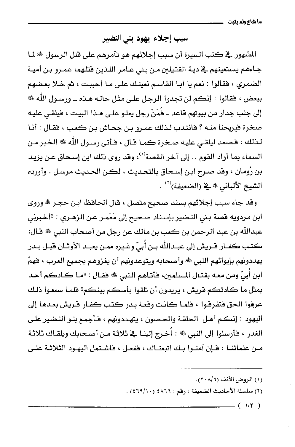المشهور في كتب السيرة أن سبب إجلائهم هو تآمرهم على قتل الرسول - صلى الله عليه وسلم - لما جاءهم يستعينهم في دية القتيلين من بني عامر اللذين قتلهما عمرو بن أمية الضمري، فقالوا: نعم يا أبا القاسم نعينك على ما أحببت، ثم خلا بعضهم ببعض، فقالوا: إنكم لن تجدوا الرجل على مثل حاله هذه - ورسول الله - صلى الله عليه وسلم - إلى جنب جدار من بيوتهم قاعد - فَمَنْ رجل يعلو على هذا البيت، فيلقي عليه صخرة فيريحنا منه؟ فانتدب لذلك عمرو بن جحاش بن كعب، فقال: أنا لذلك، فصعد ليلقي عليه صخرة كما قال، فأتى رسول الله - صلى الله عليه وسلم - الخبر من السماء بما أراد القوم .. إلى آخر القصة (¬1)، وقد روى ذلك ابن إسحاق عن يزيد بن رُومان، وقد صرح ابن إسحاق بالتحديث، لكن الحديث مرسل. وأورده الشيخ الألباني -رحمه الله- في (الضعيفة) (¬2).