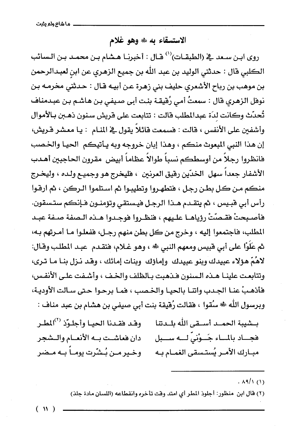 روى ابن سعد في (الطبقات) (¬1) قال: أخبرنا هشام بن محمَّد بن السائب الكلبي قال: حدثني الوليد بن عبد الله بن جميع الزهري عن ابنٍ لعبد الرحمن بن موهب بن رباح الأشعري حليف بني زهرة عن أبيه قال: حدثني مخرمه بن نوفل الزهري قال: سمعتُ أمي رُقيقة بنت أبى صيفي بن هاشم بن عبد مناف تُحدّث وكانت لِدَة عبد المطلب قالت: تتابعت على قريش سنون ذهبن بالأموال وأشفين على الأنفس، قالت: فسمعت قائلًا يقول في المنام: يا معشر قريش، إن هذا النبي المبعوث منكم، وهذا إبان خروجه وبه يأتيكم الحيا والخصب فانظروا رجلًا من أوسطكم نسبًا طوالًا عظامًا أبيض مقرون الحاجبين أهدب الأشفار جعدًا سهل الخدّين رقيق العرنين، فليخرج هو وجميع ولده، وليخرج منكم من كل بطن رجل، فتطهروا وتطيبوا ثم استلموا الركن، ثم ارقوا رأس أبي قبيس، ثم يتقدم هذا الرجل فيستقي وتؤمنون فإنكم ستسقون. فأصبحتْ فقصّتْ رؤياها عليهم، فنظروا فوجدوا هذه الصفة صفة عبد المطلب، فاجتمعوا إليه، وخرج من كل بطن منهم رجل، ففعلوا ما أمرتهم به، ثم عَلَوْا على أبي قبيس ومعهم النبي - صلى الله عليه وسلم -، وهو غلام، فتقدم عبد المطلب وقال: لا هُمّ هؤلاء عبيدك وبنو عبيدك وإماؤك وبنات إمائك، وقد نزل بنا ما ترى، وتتابعت علينا هذه السنون فذهبت بالظلف والخف، وأشفت على الأنفس، فأذهبْ عنا الجدب وأتنا بالحيا والخصب، فما برحوا حتى سالت الأودية، وبرسول الله - صلى الله عليه وسلم - سُقوا، فقالت رقيقة بنت أبي صيفي بن هشام بن عبد مناف: