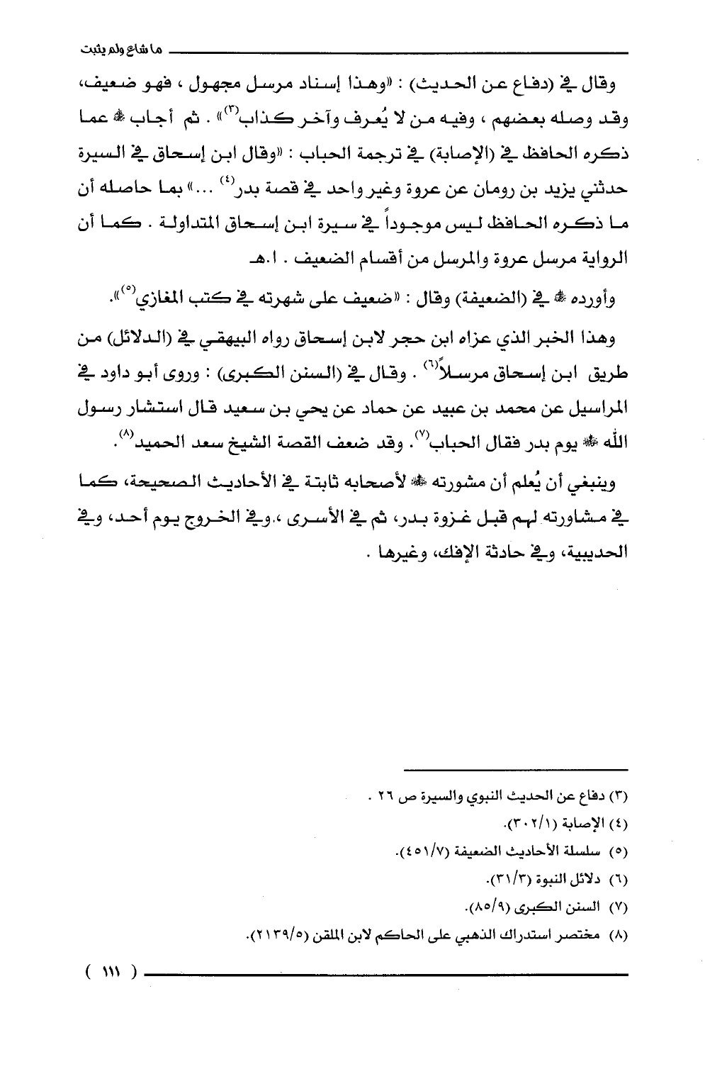 وقال في (دفاع عن الحديث): "وهذا إسناد مرسل مجهول، فهو ضعيف، وقد وصله بعضهم، وفيه من لا يُعرف وآخر كذاب (¬3) ". ثم أجاب -رحمه الله- عما ذكره الحافظ في (الإصابة) في ترجمة الحباب: "وقال ابن إسحاق في السيرة حدثني يزيد بن رومان عن عروة وغير واحد في قصة بدر (¬4) ... " بما حاصله أن ما ذكره الحافظ ليس موجودًا في سيرة ابن إسحاق المتداولة. كما أن الرواية مرسل عروة والمرسل من أقسام الضعيف. ا. هـ