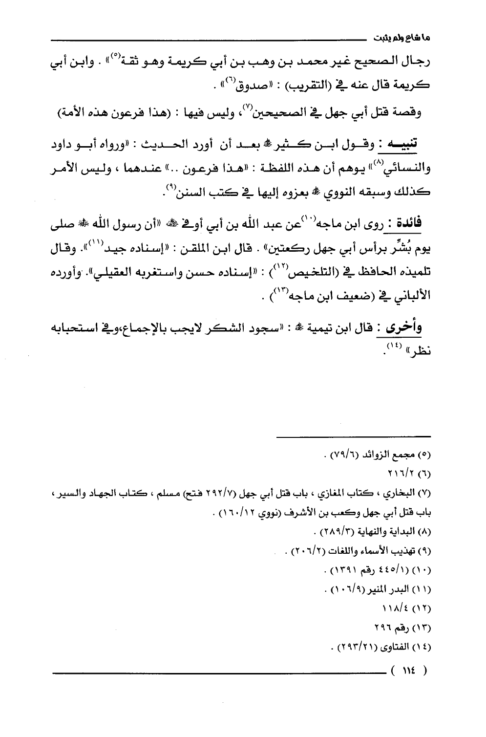 فائدة: روى ابن ماجه (¬10) عن عبد الله بن أبي أوفى - رضي الله عنه - أن رسول الله - صلى الله عليه وسلم - صلى يوم بُشِّر برأس أبي جهل ركعتين". قال ابن الملقن: "إسناده جيد (¬11) ". وقال تلميذه الحافظ في (التلخيص (¬12)): "إسناده حسن واستغربه العقيلي". وأورده الألباني في (ضعيف ابن ماجه (¬13)).