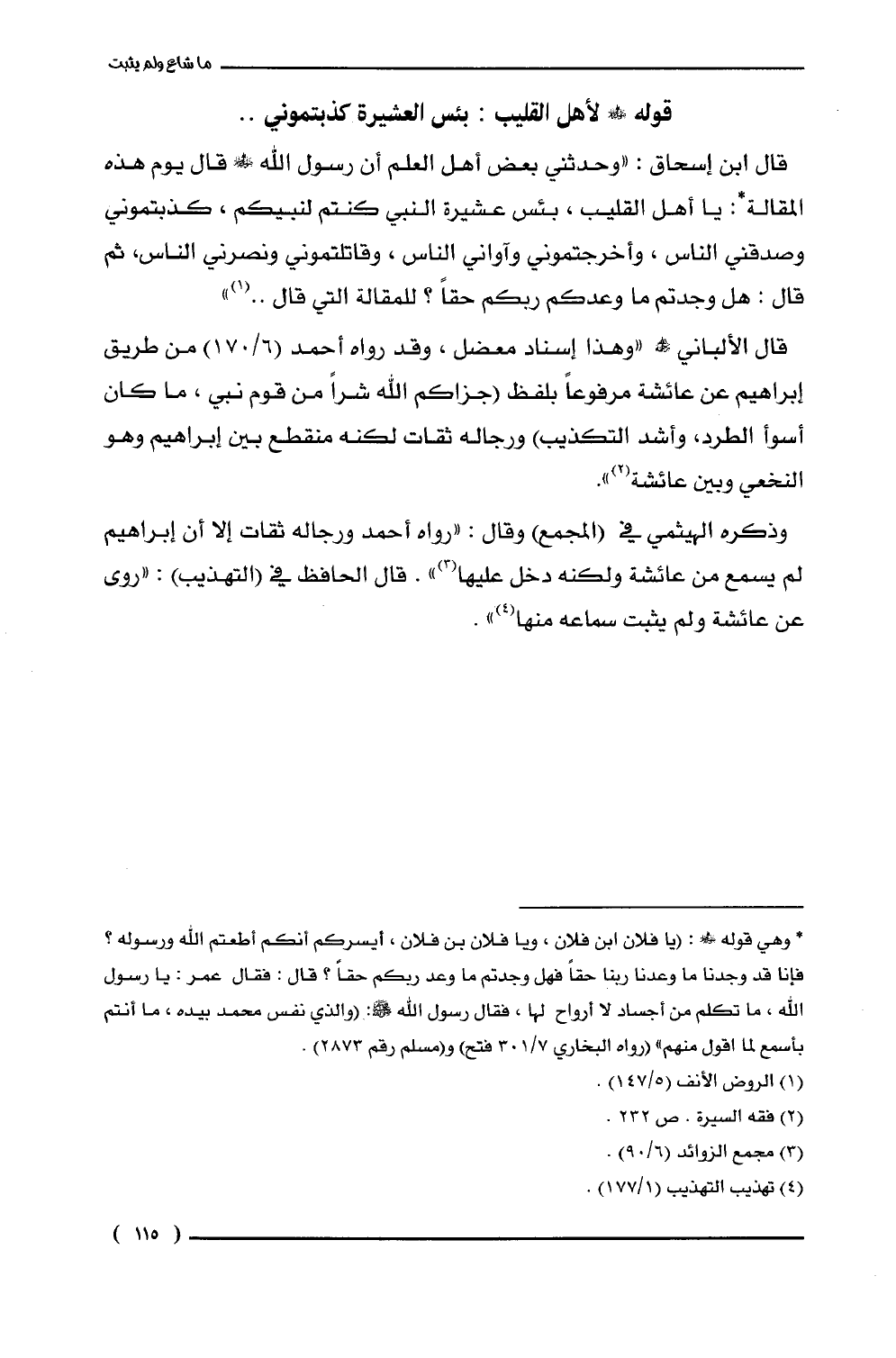 (*) وهي قوله - صلى الله عليه وسلم -: (يا فلان ابن فلان، ويا فلان بن فلان، أيسركم أنكم أطعتم الله ورسوله؟ فإنا قد وجدنا ما وعدنا ربنا حقًا فهل وجدتم ما وعد ربكم حقًا؟ قال: فقال عمر: يا رسول الله، ما تكلم من أجساد لا أرواح لها، فقال رسول الله - صلى الله عليه وسلم -: "والذي نفس محمَّد بيده، ما أنتم بأسمع لما أقول منهم" (رواه البخاري 7/ 301 فتح) و (مسلم رقم 2873).
