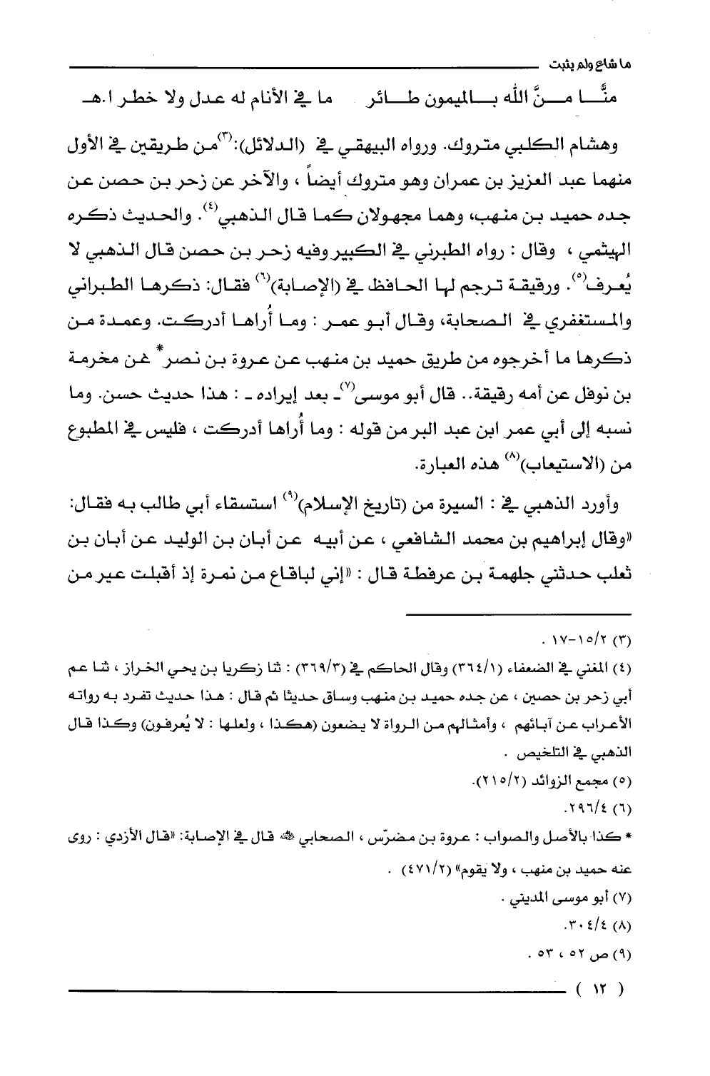 (*) كذا بالأصل والصواب: عروة بن مضرّس، الصحابي - رضي الله عنه - قال في الإصابة: "قال الأزدي: روى عنه حميد بن منهب، ولا يقوم" (2/ 471).