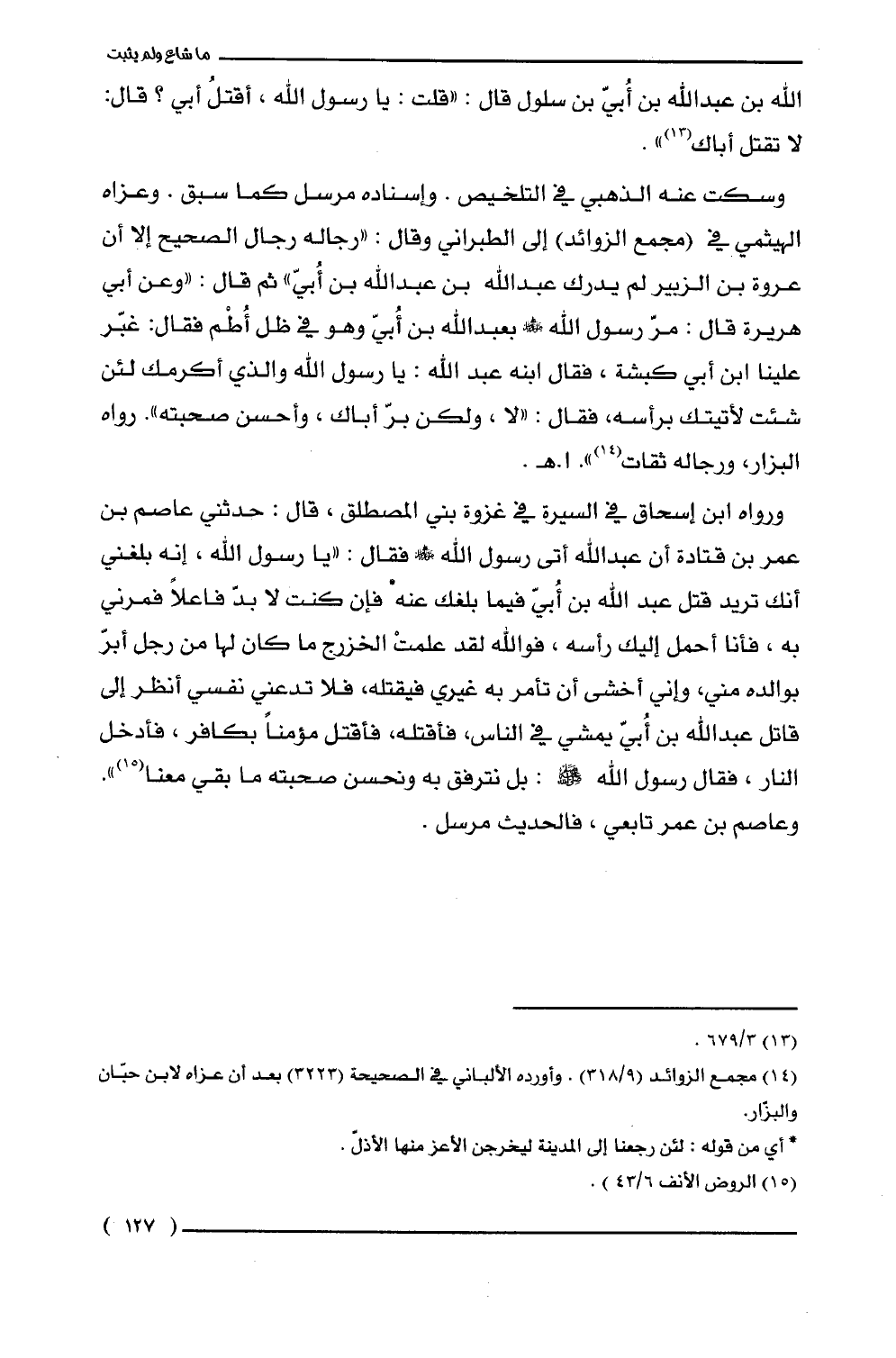 وسكت عنه الذهبي في التلخيص. وإسناده مرسل كما سبق. وعزاه الهيثمي في (مجمع الزوائد) إلى الطبراني وقال: "رجاله رجال الصحيح إلا أن عروة بن الزبير لم يدرك عبد الله بن عبد الله بن أُبيّ" ثم قال: "وعن أبي هريرة قال: مرّ رسول الله - صلى الله عليه وسلم - بعبد الله بن أُبيّ وهو في ظل أُطْم فقال: غبّر علينا ابن أبي كبشة، فقال ابنه عبد الله: يا رسول الله - صلى الله عليه وسلم - والذي أكرمك لئِّن شئت لأتيتك برأسه، فقال: "لا، ولكن برّ أباك، وأحسن صحبته". رواه البزار، ورجاله ثقات (¬14) ". ا. هـ.