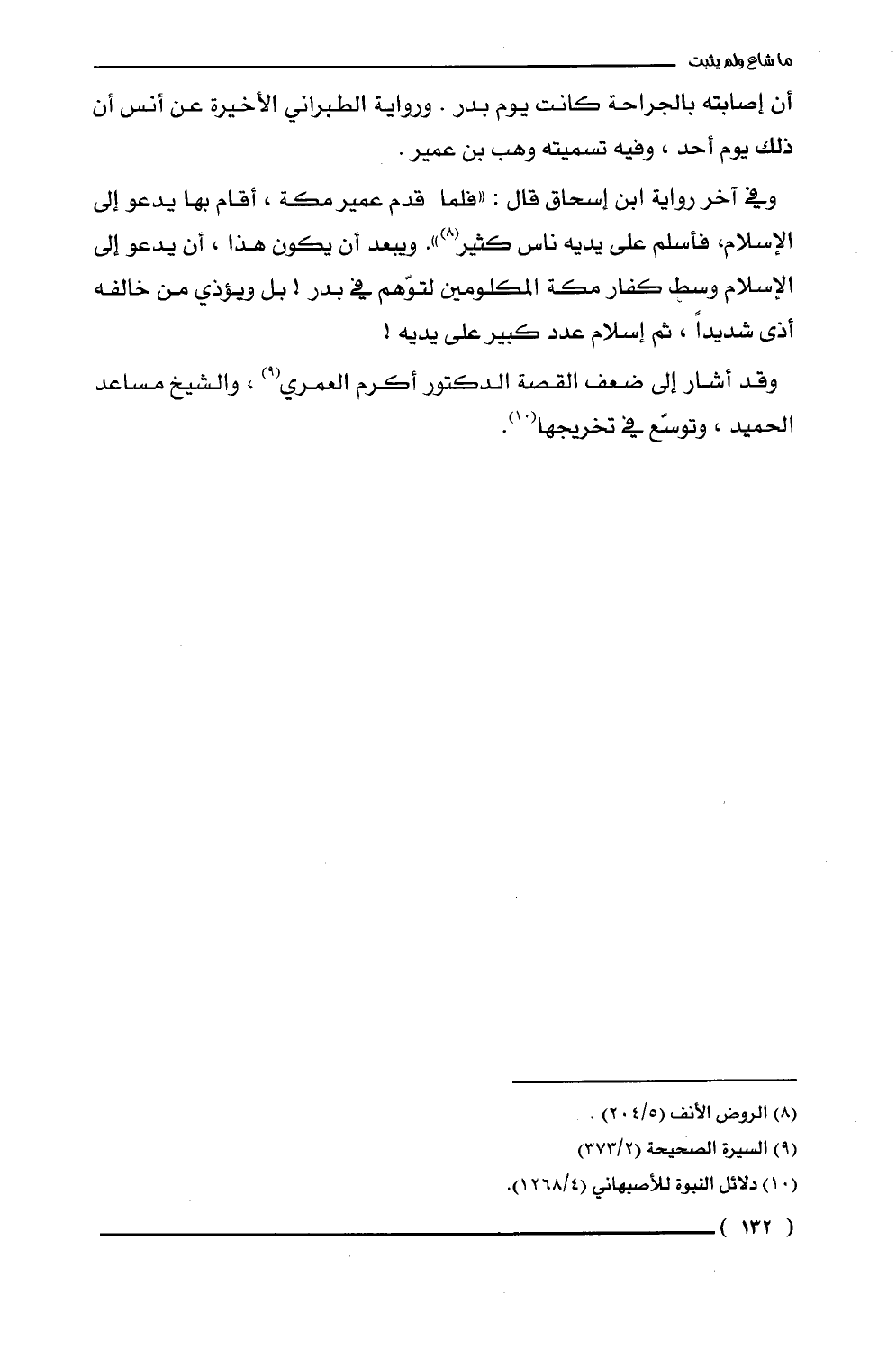 وفي آخر رواية ابن إسحاق قال: "فلما قدم عمير مكة، أقام بها يدعو إلى الإِسلام، فأسلم على يديه ناس كثير (¬8) ". ويبعد أن يكون هذا، أن يدعو إلى الإِسلام وسط كفار مكة المكلومين لتوّهم في بدر! بل ويؤذي من خالفه أذى شديدًا، ثم إسلام عدد كبير على يديه!