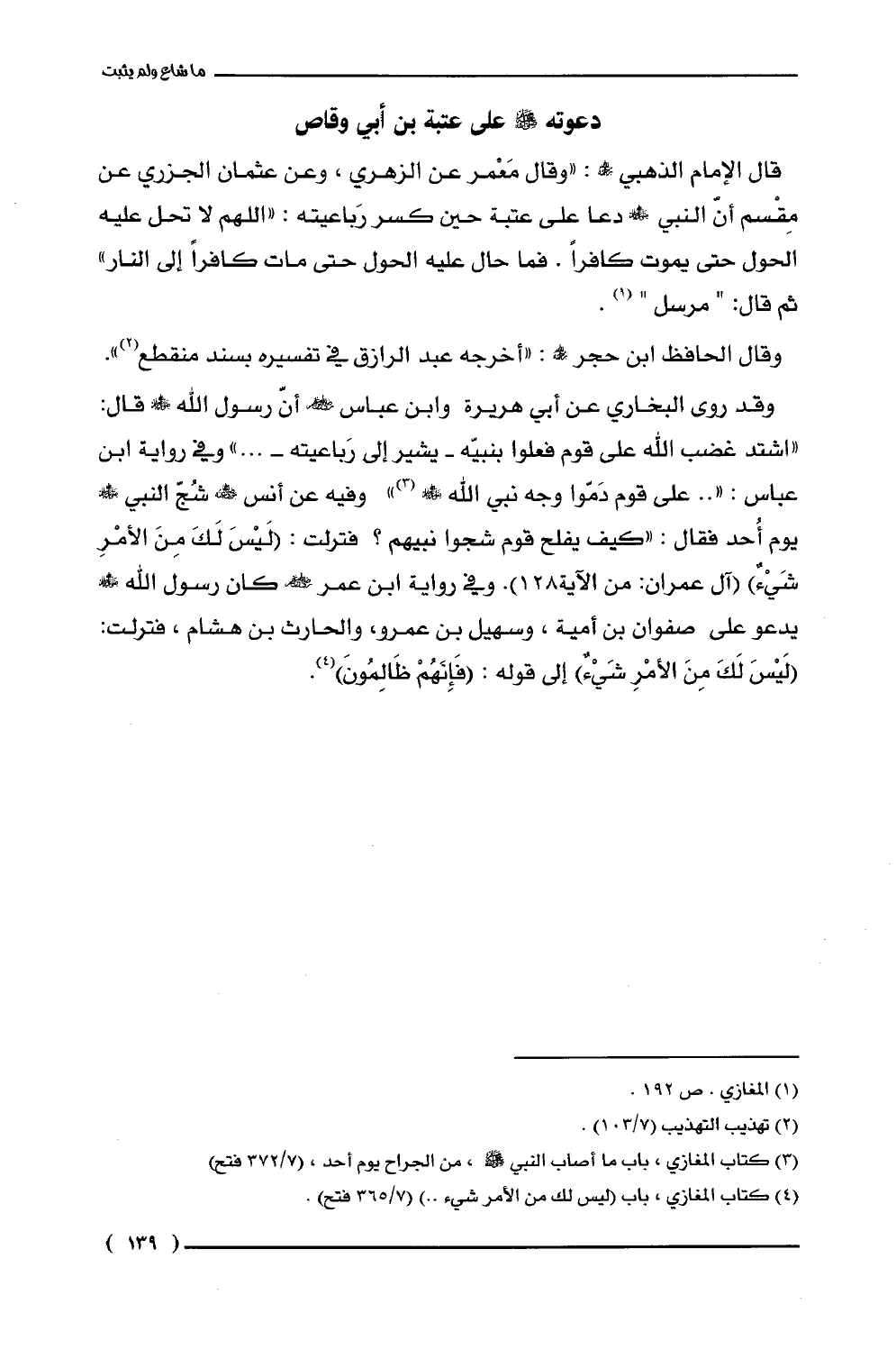 قال الإِمام الذهبي-رحمه الله-: "وقال مَعمر عن الزهري، وعن عثمان الجزري عن مِقْسم أن النبي - صلى الله عليه وسلم - دعا على عتبة حين كسر رَباعيته: "اللهم لا تحل عليه الحول حتى يموت كافرًا. فما حال عليه الحول حتى مات كافرًا إلى النار" ثم قال: "مرسل" (¬1).