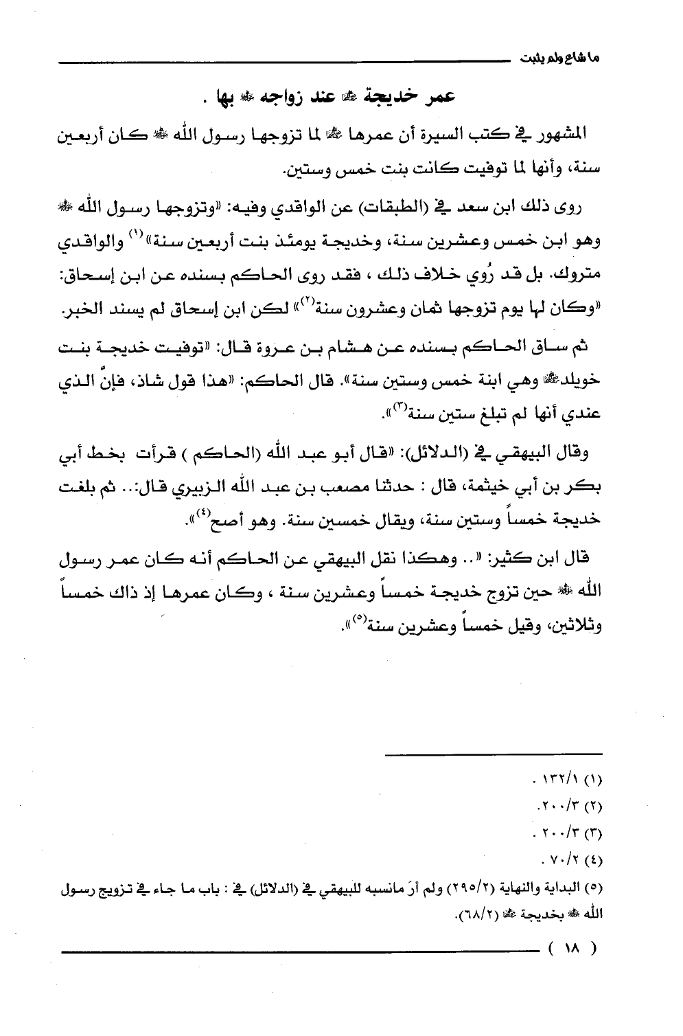 وقال البيهقي في (الدلائل): "قال أبو عبد الله (الحاكم) قرأت بخط أبي بكر بن أبي خيثمة، قال: حدثنا مصعب بن عبد الله الزبيري قال: .. ثم بلغت خديجة خمسًا وستين سنة، ويقال خمسين سنة. وهو أصح (¬4) ".