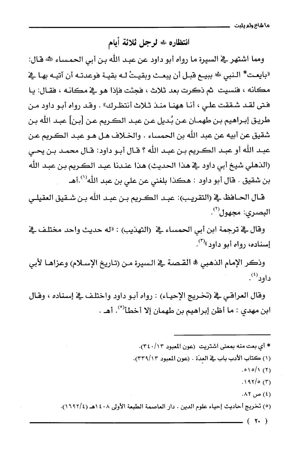 ومما اشتهر في السيرة ما رواه أبو داود عن عبد الله بن أبي الحمساء - رضي الله عنه - قال: "بايعت (*) النبي - صلى الله عليه وسلم - ببيع قبل أن يبعث وبقيتْ له بقية فوعدته أن آتيه بها في مكانه، فنسيت ثم ذكرت بعد ثلاث، فجئت فإذا هو في مكانه، فقال: يا فتى لقد شققت علي، أنا ههنا منذ ثلاث أنتظرك". وقد رواه أبو داود من طريق إبراهيم بن طهمان عن بُديل عن عبد الكريم عن [بن] عبد الله بن شقيق عن أبيه عن عبد الله بن الحمساء. والخلاف هل هو عبد الكريم عن عبد الله أو عبد الكريم بن عبد الله؟ قال أبو داود: قال محمَّد بن يحي (الذهلي شيخ أبي داود في هذا الحديث) هذا عندنا عبد الكريم بن عبد الله بن شقيق. قال أبو داود: هكذا بلغني عن علي بن عبد الله (¬1). أهـ