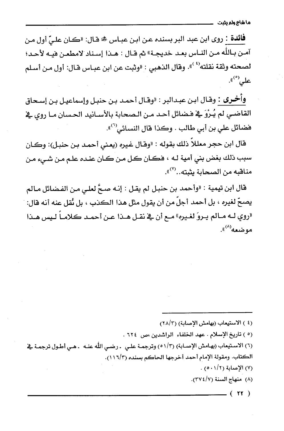 (¬6) الاستيعاب (بهامش الإصابة) (3/ 51) وترجمة علي - رضي الله عنه - هي أطول ترجمة في الكتاب. ومقولة الإِمام أحمد أخرجها الحاكم بسنده (3/ 116).