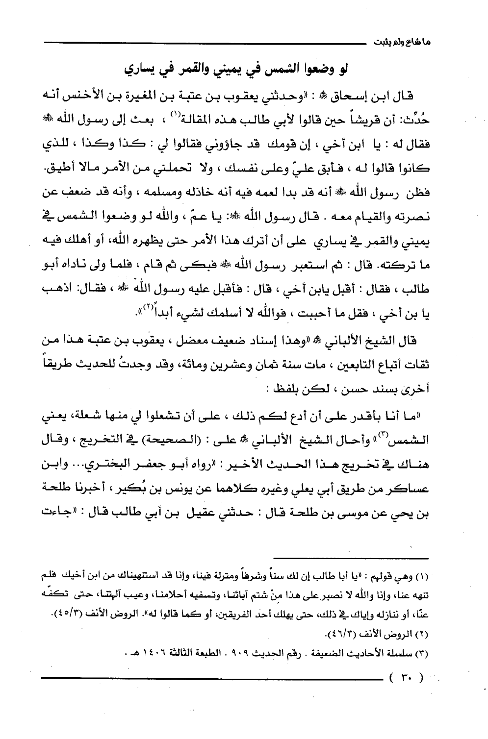 "ما أنا بأقدر على أن أدع لكم ذلك، على أن تشعلوا لي منها شعلة، يعنى الشمس (¬3) " وأحال الشيخ الألباني -رحمه الله- على: (الصحيحة) في التخريج، وقال هناك في تخريج هذا الحديث الأخير: "رواه أبو جعفر البختري ... وابن عساكر من طريق أبي يعلي وغيره كلاهما عن يونس بن بُكير، أخبرنا طلحة بن يحي عن موسى بن طلحة قال: حدثنى عقيل بن أبي طالب قال: "جاءت