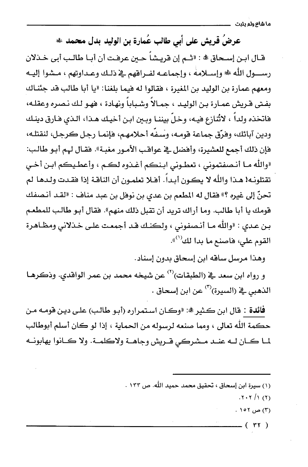 قال ابن إسحاق -رحمه الله-: "ثم إن قريشًا حين عرفت أن أبا طالب أبى خذلان رسول الله - صلى الله عليه وسلم - وإسلامه، وإجماعه لفراقهم في ذلك وعداوتهم، مشوا إليه ومعهم عمارة بن الوليد بن المغيرة، فقالوا له فيما بلغنا: "يا أبا طالب قد جئناك بفتى قريش عمارة بن الوليد، جمالًا وشبابًا ونهادة، فهو لك نصره وعقله، فاتخذه ولدًا، لاتُنازع فيه، وخلّ بيننا وبين ابن اخيك هذا، الذي فارق دينك ودين آبائك، وفرّق جماعة قومه، وسفّه أحلامهم، فإنما رجل كرجل، لنقتله، فإن ذلك أجمع للعشيرة، وأفضل في عواقب الأمور مغبة". فقال لهم أبو طالب: "والله ما أنصفتموني، تعطوني ابنكم أغذوه لكم، وأعطيكم ابن أخي تقتلونه! هذا والله لا يكون أبدًا. أفلا تعلمون أن الناقة إذا فقدت ولدها لم تحنّ إلى غيره؟ " فقال له المطعم بن عدي بن نوفل بن عبد مناف: "لقد أنصفك قومك يا أبا طالب. وما أراك تريد أن تقبل ذلك منهم". فقال أبو طالب للمطعم بن عدي: "والله ما أنصفوني، ولكنك قد أجمعت على خذلاني ومظاهرة القوم علي، فاصنع ما بدا لك (¬1) ".