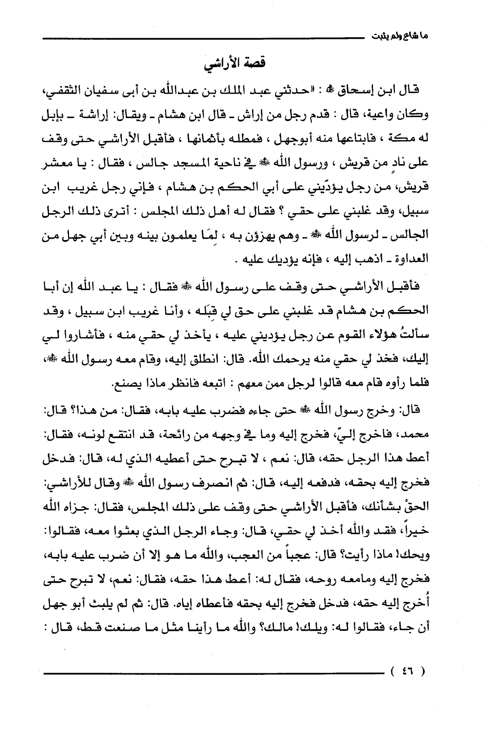 فأقبل الأراشي حتى وقف على رسول الله - صلى الله عليه وسلم - فقال: يا عبد الله إن أبا الحكم بن هشام قد غلبني على حق لي قِبَله، وأنا غريب ابن سبيل، وقد سألتُ هؤلاء القوم عن رجل يؤديني عليه، يأخذ لي حقي منه، فأشاروا لي إليك، فخذ لي حقي منه يرحمك الله. قال: انطلق إليه، وقام معه رسول الله - صلى الله عليه وسلم - َ، فلما رأوه قام معه قالوا لرجل ممن معهم: اتبعه فانظر ماذا يصنع.
