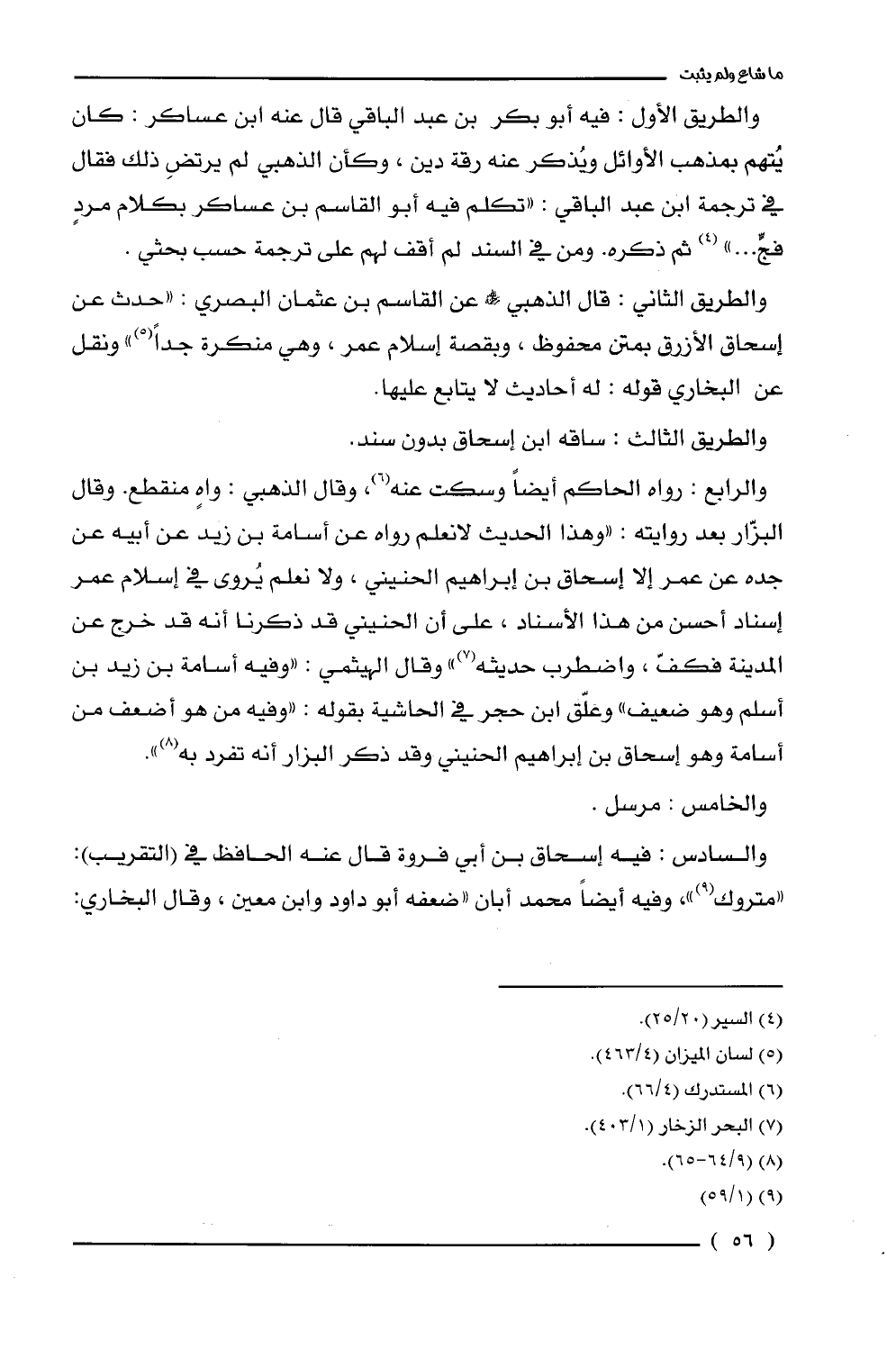 والرابع: رواه الحاكم أيضًا وسكت عنه (¬6)، وقال الذهبي: واهٍ منقطع. وقال البزّار بعد روايته: "وهذا الحديث لا نعلم رواه عن أسامة بن زيد عن أبيه عن جده عن عمر إلا إسحاق بن إبراهيم الحنيني، ولا نعلم يُروى في إسلام عمر إسناد أحسن من هذا الإسناد، على أن الحنيني قد ذكرنا أنه قد خرج عن المدينة فكفّ، واضطرب حديثه (¬7) " وقال الهيثمي: "وفيه أسامة بن زيد بن أسلم وهو ضعيف" وعلّق ابن حجر في الحاشية بقوله: "وفيه من هو أضعف من أسامة وهو إسحاق بن إبراهيم الحنيني وقد ذكر البزار أنه تفرد به (¬8) ".