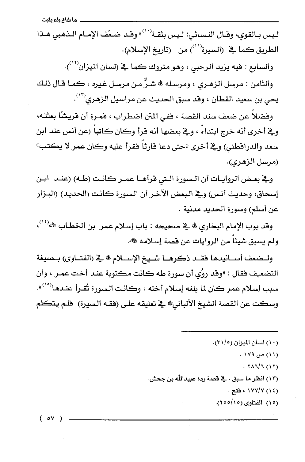 ولضعف أسانيدها فقد ذكرها شيخ الإِسلام -رحمه الله- في (الفتاوى) بصيغة التضعيف فقال: "وقد روُي أن سورة طه كانت مكتوبة عند أخت عمر، وأن سبب إسلام عمر كان لما بلغه إسلام أخته، وكانت السورة تُقرأ عندها (¬15) ".
