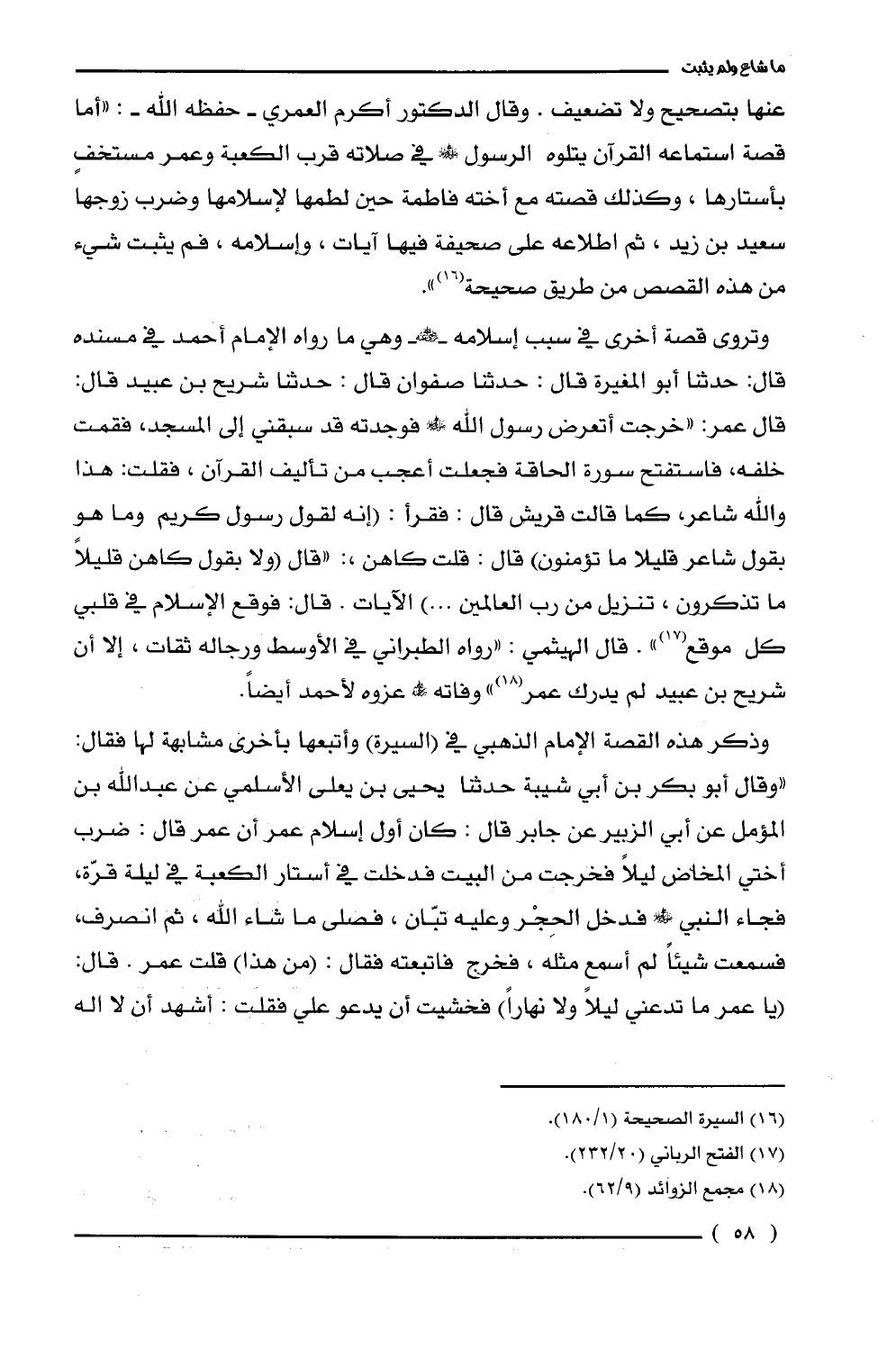 عنها بتصحيح ولا تضعيف. وقال الدكتور أكرم العمري -حفظه الله -: "أما قصة استماعه القرآن يتلوه الرسول - صلى الله عليه وسلم - في صلاته قرب الكعبة وعمر مستخفٍ بأستارها، وكذلك قصته مع أخته فاطمة حين لطمها لإسلامها وضرب زوجها سعيد بن زيد، ثم اطلاعه على صحيفة فيها آيات، وإسلامه، فلم يثبت شيء من هذه القصص من طريق صحيحة (¬16) ".
