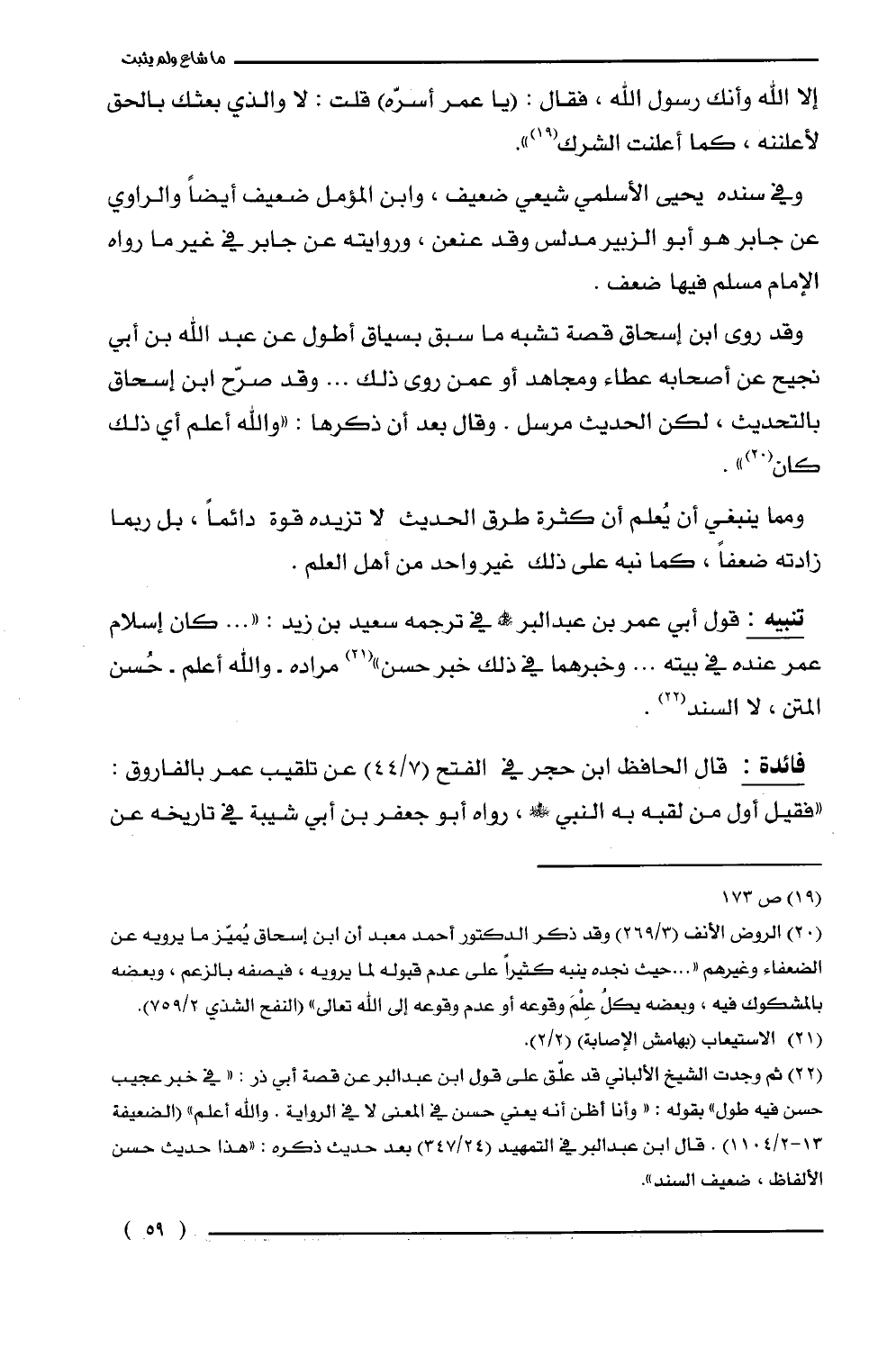 (¬20) الروض الأنف (3/ 269) وقد ذكر الدكتور أحمد معبد أن ابن إسحاق يُميّز ما يرويه عن الضعفاء وغيرهم " ... حيث نجده ينبه كثيرًا على عدم قبوله لما يرويه، فيصفه بالزعم، وبعضه بالمشكوك فيه، وبعضه يكلُ عِلْمَ وقوعه أو عدم وقوعه إلى الله تعالى" (النفح الشذي 2/ 759).