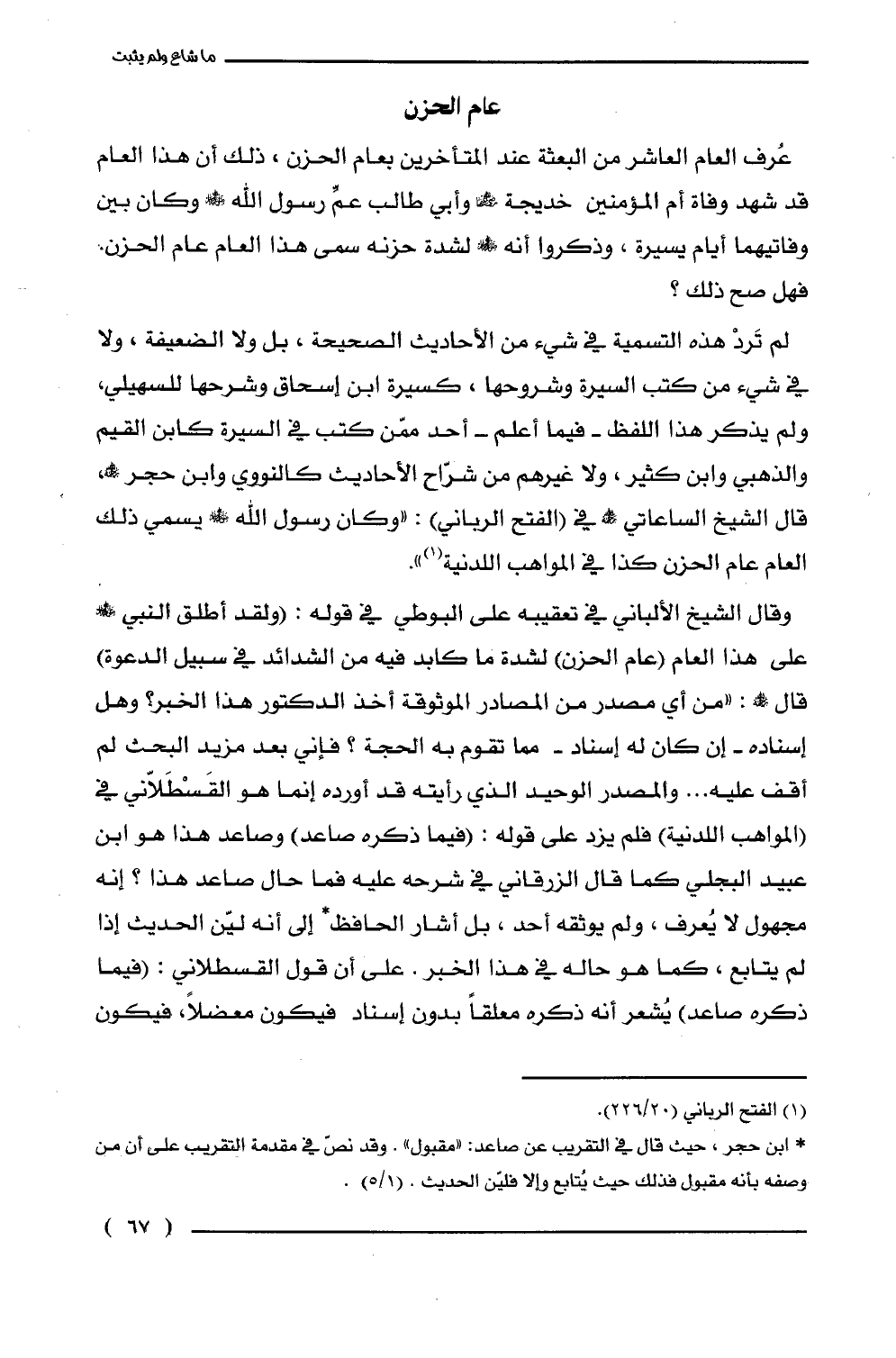وقال الشيخ الألباني في تعقيبه على البوطي في قوله: (ولقد أطلق النبي - صلى الله عليه وسلم - على هذا العام (عام الحزن) لشدة ما كابد فيه من الشدائد في سبيل الدعوة) قال -رحمه الله-: "من أي مصدر من المصادر الموثوقة أخذ الدكتور هذا الخبر؟ وهل إسناده -إن كان له إسناد- مما تقوم به الحجة؟ فإني بعد مزيد البحث لم أقف عليه ... والمصدر الوحيد الذي رأيته قد أورده إنما هو القَسطَلاّني في (المواهب اللدنية) فلم يزد على قوله: (فيما ذكره صاعد) وصاعد هذا هو ابن عبيد البجلي كما قال الزرقاني في شرحه عليه فما حال صاعد هذا؟ إنه مجهول لا يُعرف، ولم يوثقه أحد، بل أشار الحافظ (*) إلى أنه ليّن الحديث إذا لم يتابع، كما هو حاله في هذا الخبر. على أن قول القسطلاني: (فيما ذكره صاعد) يُشعر أنه ذكره معلقًا بدون إسناد فيكون معضلًا، فيكون