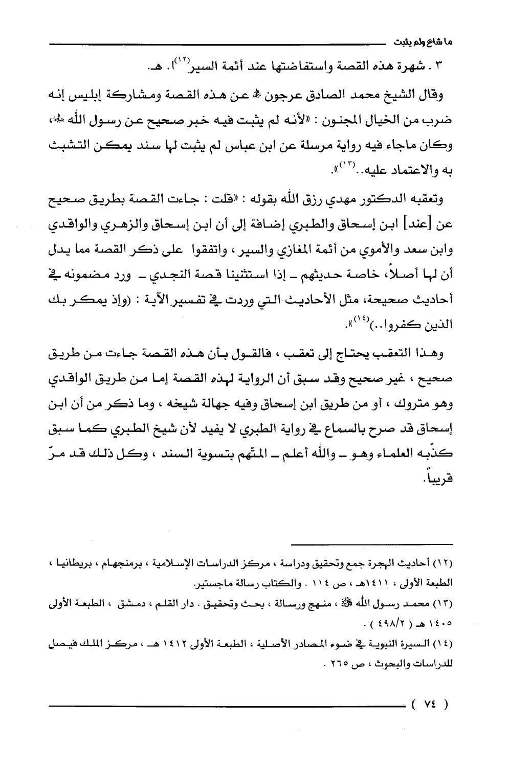 وتعقبه الدكتور مهدي رزق الله بقوله: "قلت: جاءت القصة بطريق صحيح عن [عند] ابن إسحاق والطبري إضافة إلى أن ابن إسحاق والزهري والواقدي وابن سعد والأموي من أئمة المغازي والسير، واتفقوا على ذكر القصة مما يدل أن لها أصلًا، خاصة حديثهم -إذا استثنينا قصة النجدي- ورد مضمونه في أحاديث صحيحة، مثل الأحاديث التي وردت في تفسيير الآية: {وَإِذْ يَمْكُرُ بِكَ الَّذِينَ كَفَرُوا ... } (¬14) ".
