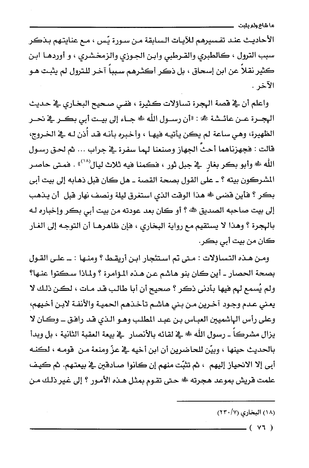 واعلم أن في قصة الهجرة تساؤلات كثيرة، ففي صحيح البخاري في حديث الهجرة عن عائشة - رضي الله عنها: "أن رسول الله - صلى الله عليه وسلم - جاء إلى بيت أبي بكر في نحر الظهيرة، وهي ساعة لم يكن يأتيه فيها، وأخبره بأنه قد أُذن له في الخروج، قالت: فجهزناهما أحثَّ الجهاز وصنعنا لهما سفرة في جراب ... ثم لحق رسول الله - صلى الله عليه وسلم - وأبو بكر بغارٍ في جبل ثور، فكمنا فيه ثلاث ليال (¬18) ". فمتى حاصر المشركون بيته؟ -على القول بصحة القصة- هل كان قبل ذهابه إلى بيت أبى بكر؟ فأين قضى - صلى الله عليه وسلم - هذا الوقت الذي استغرق ليلة ونصف نهار قبل أن يذهب إلى بيت صاحبه الصديق - رضي الله عنه -؟ أو كان بعد عودته من بيت أبي بكر وإخباره له بالهجرة؟ وهذا لا يستقيم مع رواية البخاري، فإن ظاهرها أن التوجه إلى الغار كان من بيت أبي بكر.
