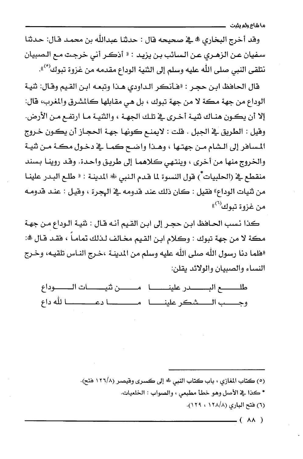 وقد أخرج البخاري -رحمه الله- في صحيحه قال: حدثنا عبد الله بن محمَّد قال: حدثنا سفيان عن الزهري عن السائب بن يزيد: "أذكر أني خرجت مع الصبيان نتلقى النبي - صلى الله عليه وسلم - إلى الثنية الوداع مقدمه من غزوة تبوك (¬5) ". قال الحافظ ابن حجر: "فأنكر الداودي هذا وتبعه ابن القيم وقال: ثنية الوداع من جهة مكة لا من جهة تبوك، بل هي مقابلها كالمشرق والمغرب، قال: إلا أن يكون هناك ثنية أخرى في تلك الجهة، والثنية ما ارتفع من الأرض. وقيل: الطريق في الجبل. قلت: لا يمنع كونها جهة الحجاز أن يكون خروج المسافر إلى الشام من جهتها، وهذا واضع كما في دخول مكة من ثنية والخروج منها من أخرى، وينتهي كلاهما إلى طريق واحدة. وقد روينا بسند منقطع في (الحلبيات (*)) قول النسوة لما قدم النبي - صلى الله عليه وسلم - المدينة: "طلع البدر علينا من ثنيات الوداع " فقيل: كان ذلك عند قدومه في الهجرة، وقيل: عند قدومه من غزوه تبوك (¬6) "