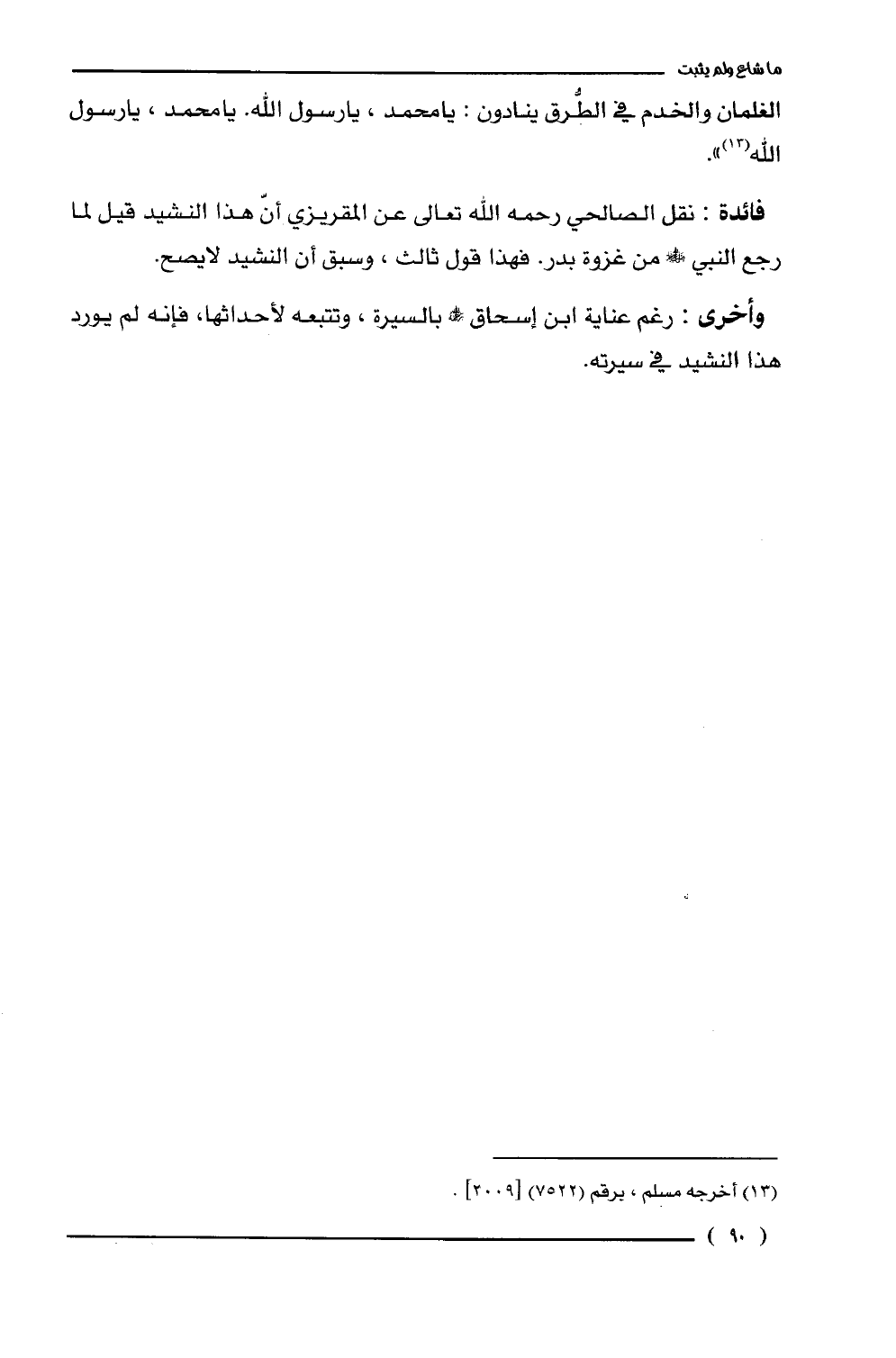 فائدة: نقل الصالحي رحمه الله تعالى عن المقريزي أنّ هذا النشيد قيل لما رجع النبي - صلى الله عليه وسلم - من غزوة بدر. فهذا قول ثالث، وسبق أن النشيد لا يصح.