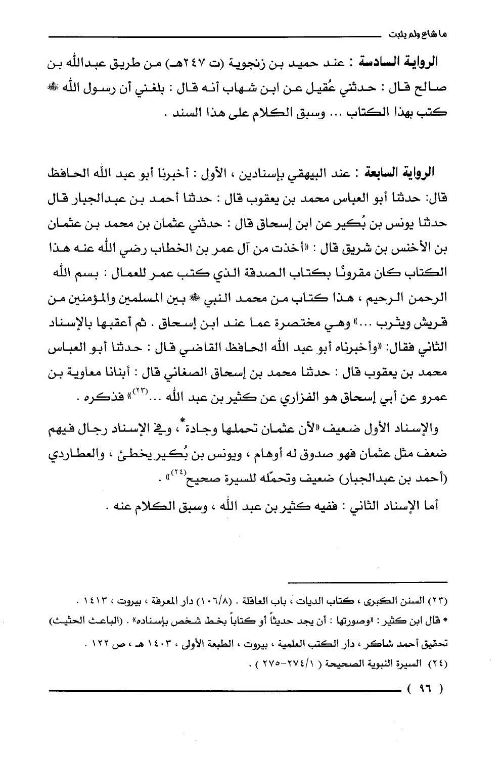الرواية السادسة: عند حميد بن زنجوية (ت 247 هـ) من طريق عبد الله بن صالح قال: حدثني عُقيل عن ابن شهاب أنه قال: بلغني أن رسول الله - صلى الله عليه وسلم - كتب بهذا الكتاب ... وسبق الكلام على هذا السند.