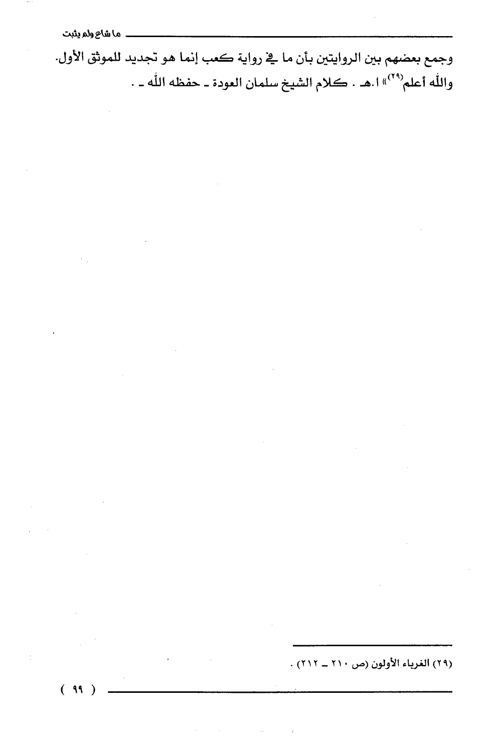 وجمع بعضهم بين الروايتين بأن ما في رواية كعب إنما هو تجديد للموثق الأول. والله أعلم (¬29) " ا. هـ. كلام الشيخ سلمان العودة -حفظه الله -.