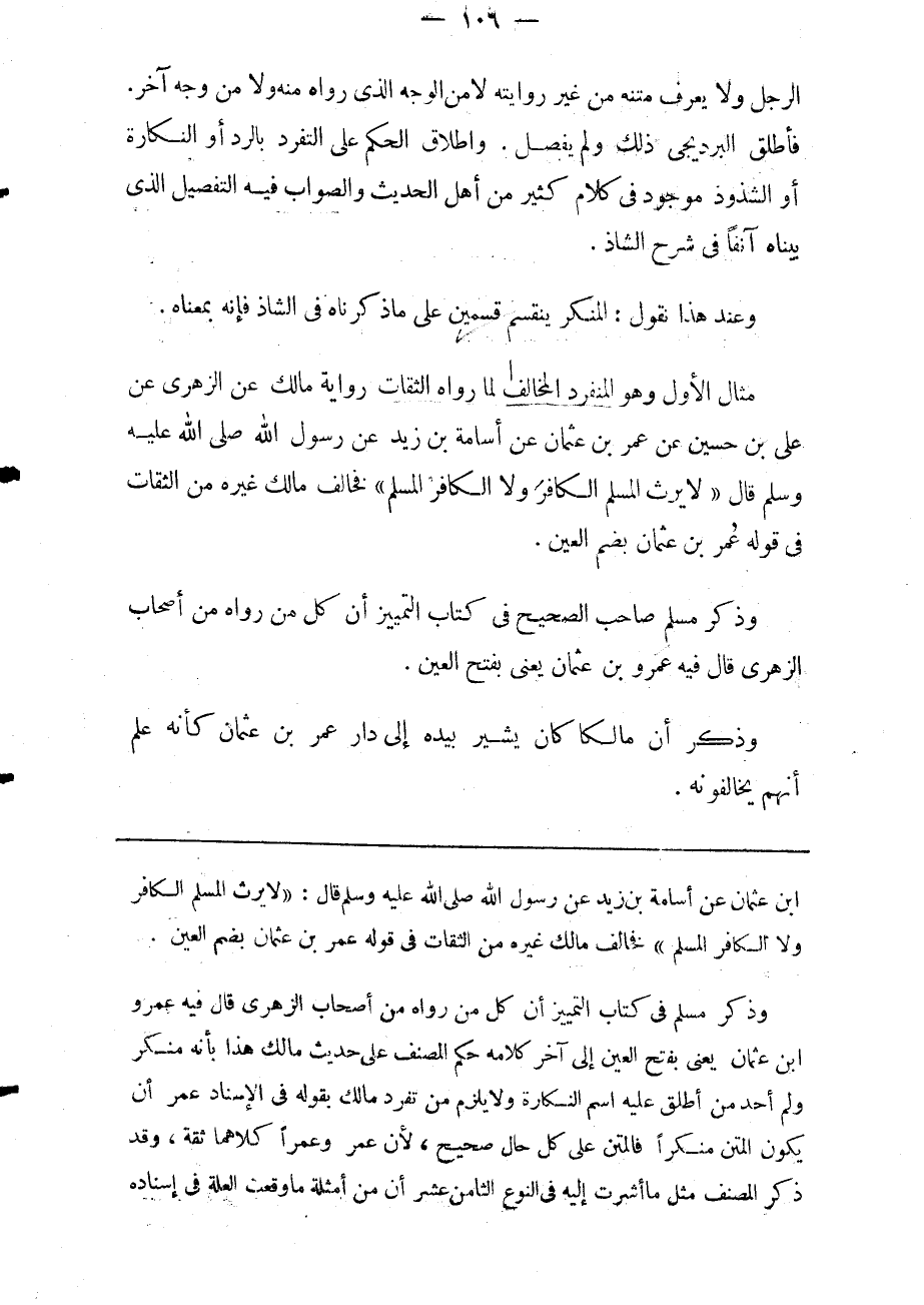 ابن عثمان عن أسامة بن زيد عن رسول الله صلى الله عليه وسلم قال: "لا يرث المسلم الكافر ولا الكافر المسلم" فخالف مالك غيره من الثقات في قوله عمر بن عثمان بضم العين.