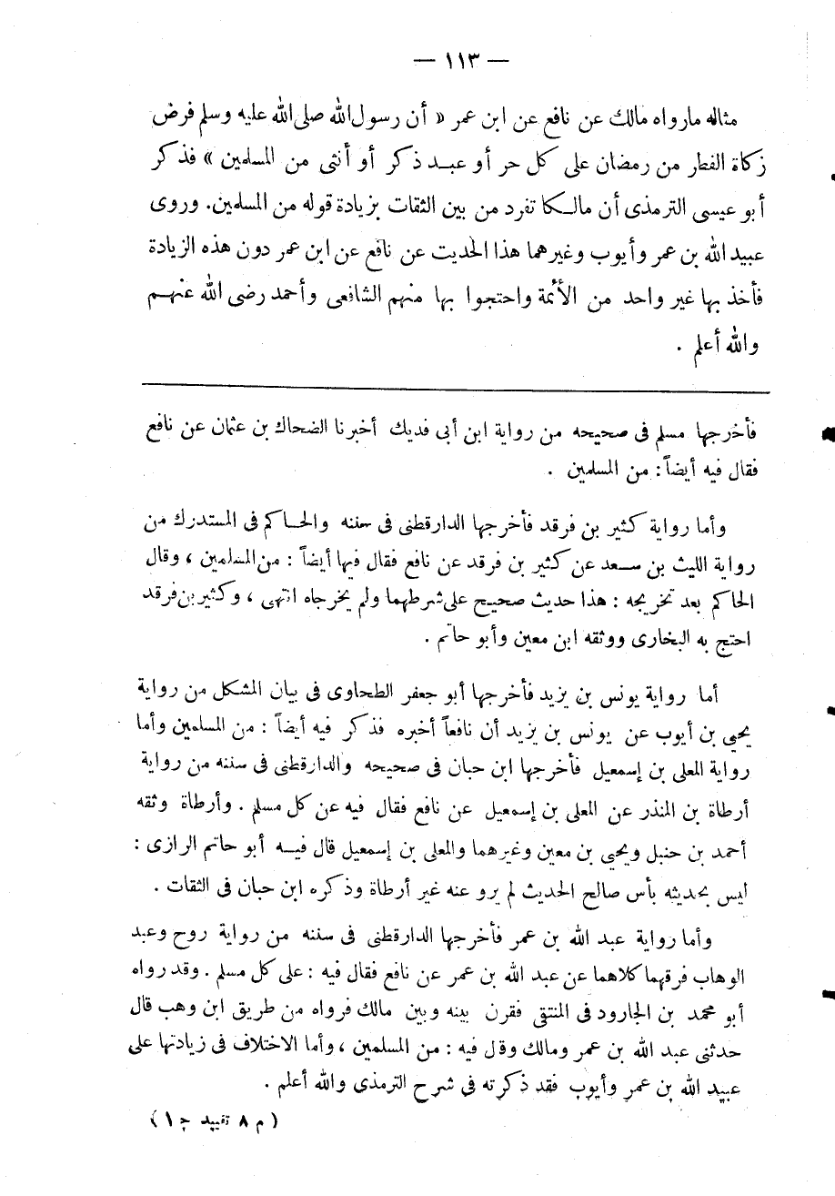 وأما رواية عبد الله بن عمر فأخرجها الدارقطنى في سننه من رواية روح وعبد الوهاب فرقهما كلاهما عن عبد الله بن عمر عن نافع فقال فيه على كل مسلم وقد رواه أبو محمد بن الجارود في المنتقى فقرن بينه وبين مالك فرواه من طريق ابن وهب قال حدثني عبد الله بن عمر ومالك وقال فيه من المسلمين وأما إلاختلاف في زيادتها على عبيد الله بن عمر وأيوب فقد ذكرته في شرح الترمذي والله أعلم.