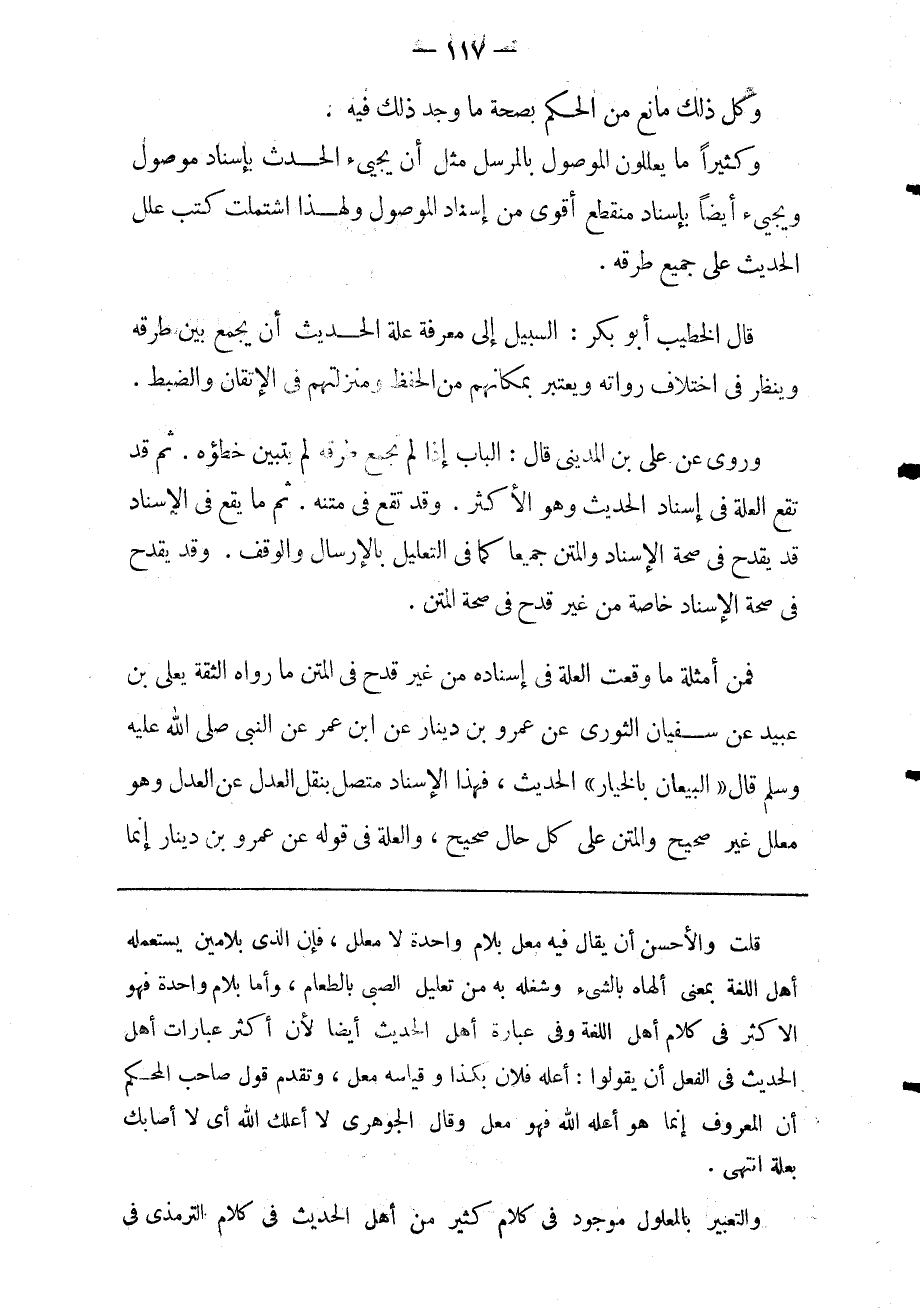 وروى عن علي بن المديني قال: الباب إذا لم تجمع طرقه لم يتبين خطأه ثم قد تقع العلة في إسناد الحديث وهو ألأكثر وقد تقع في متنه ثم ما يقع في الإسناد قد يقدح في صحة الإسناد والمتن جميعا كما في التعليل بإلارسال والوقف. وقد يقدح في صحة الإسناد خاصة من غير قدح في صحة المتن.