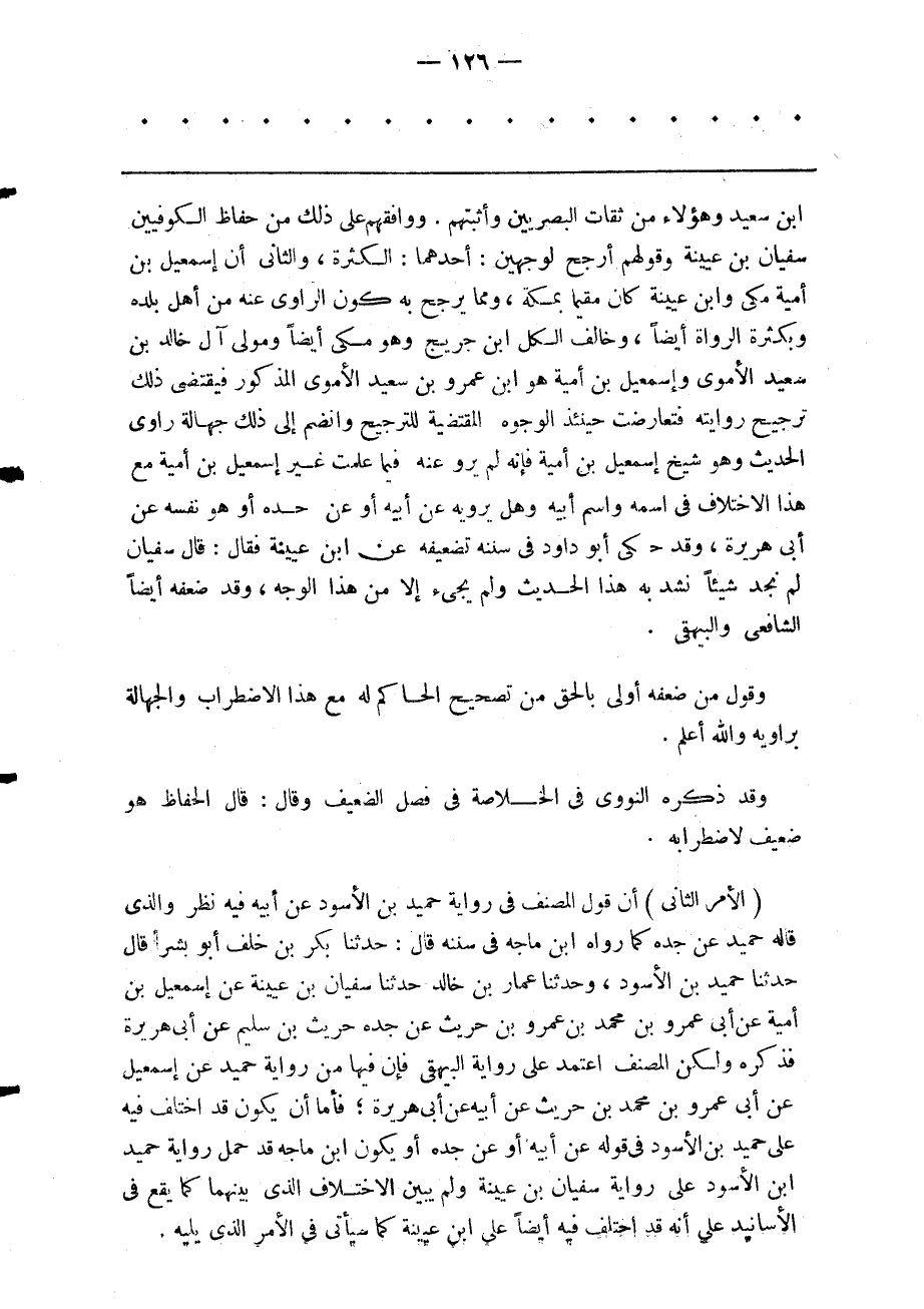ابن سعيد وهؤلاء من ثقات البصريين وأثبتهم ووافقهم على ذلك من حفاظ الكوفيين سفيان بن عيينة وقولهم أرجح لوجهين أحدهما الكثرة والثاني أن إسماعيل بن أمية مكي وابن عيينة كان مقيما بمكة ومما يرجح به كون الراوي عنه من أهل بلده وبكثرة الرواة أيضا وخالف الكل ابن جريج وهو مكي أيضا ومولى آل خالد بن سعيد إلاموي وإسماعيل بن أمية هو ابن عمرو بن سعيد إلاموي المذكور فيقتضى ذلك ترجيح روايته فتعارضت حينئذ الوجوه المقتضية للترجيح وانضم إلى ذلك جهالة راوي الحديث وهو شيخ إسماعيل بن أمية فإنه لم يرو عنه فيما علمت غير إسماعيل بن أمية مع هذا إلاختلاف في اسمه واسم أبيه وهل يرويه عن أبيه أو عن جده أو هو نفسه عن أبى هريرة وقد حكي أبو داود في سننه تضعيفه عن ابن عيينة فقال قال سفيان لم نجد شيئا نشد به هذا الحديث ولم يجئ إلا من هذا الوجه وقد ضعفه أيضا الشافعي والبيهقي.
