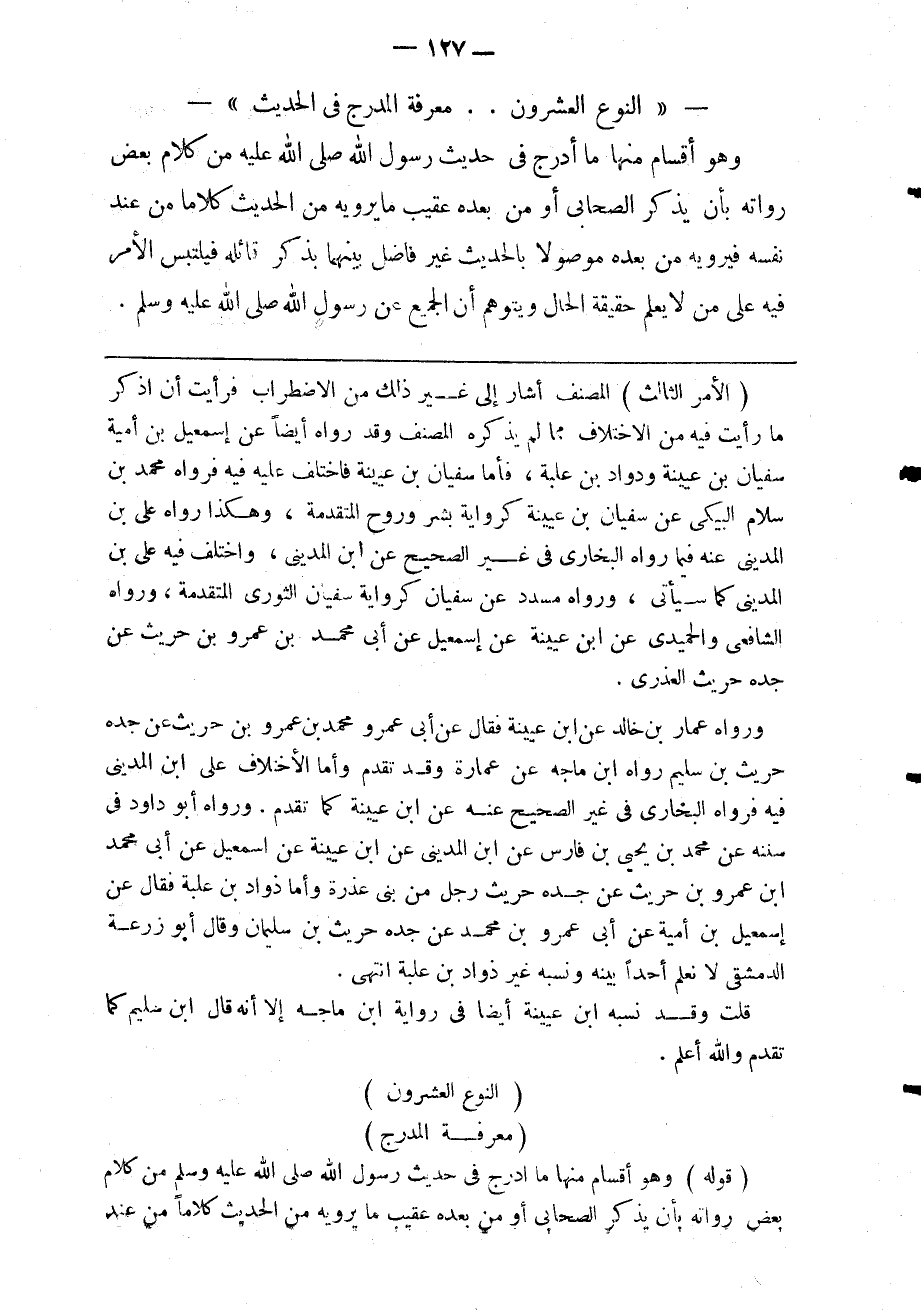 منها: ما أدرج في حديث رسول الله صلى الله عليه وسلم من كلام بعض رواته بأن يذكر الصحابي أو: من بعده عقيب ما يرويه من الحديث كلاما من عند نفسه فيرويه من بعده موصولا بالحديث غير فاصل بينهما بذكر قائله فيلتبس إلامر فيه على من لا يعلم حقيقة الحال ويتوهم أن الجميع عن رسول الله صلى الله عليه وسلم.